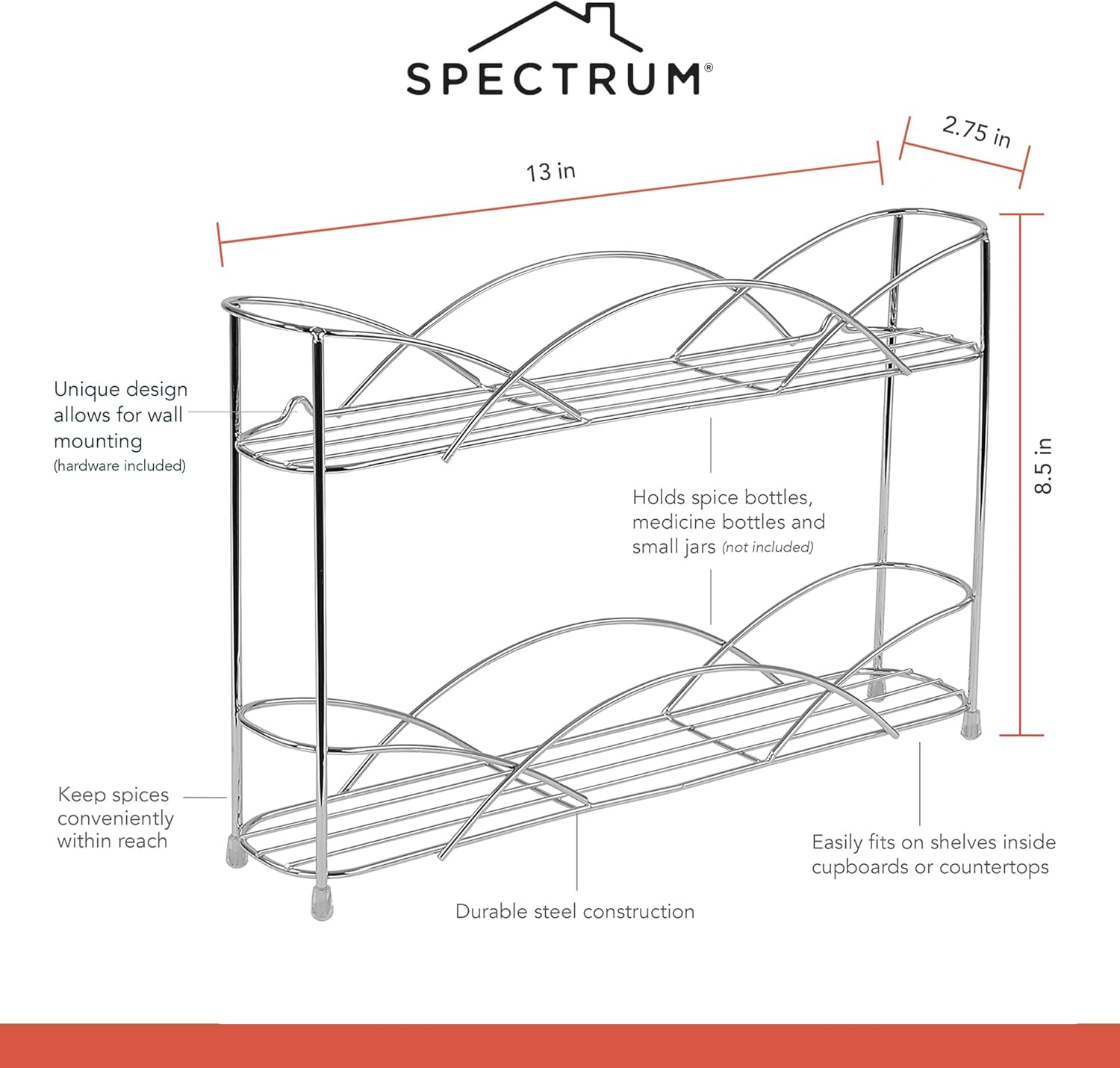 - Streamlined, Stylish Design: The simple, minimalist design of the Spectrum Countertop & Wall Mount Spice Rack is the perfect wire spice rack to organize your kitchen in style. 2-tier in chrome.