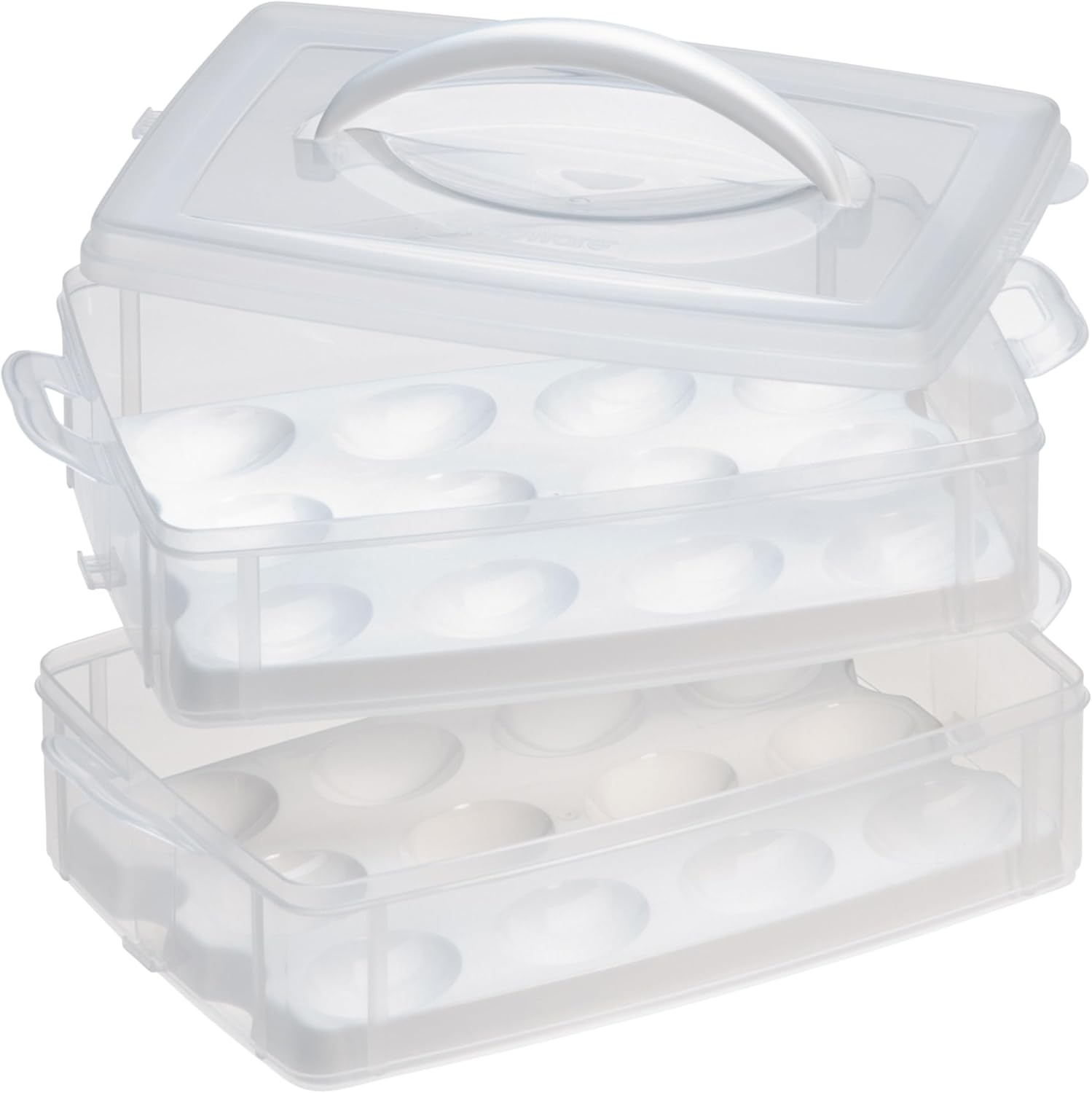 - EGG CARRIER: The Snapware Snap 'N Stack 2-layer carrier is perfect for transporting eggs and all manner of sweets with safety. Two holders can hold up to 24 eggs or treats, and the stackable trays keep food items separate and organized.