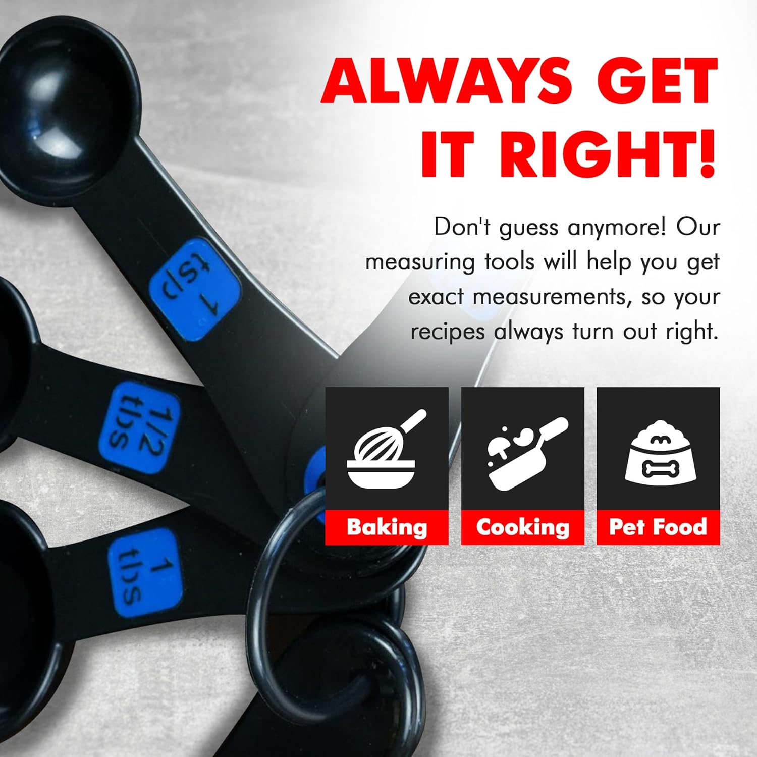 - Includes 1/8 tsp, 1/4 tsp, 1/2 tsp, 1 tsp, 1/2 tbsp, 1 tbsp, 1/4 cup, 1/3 cup, 1/2 cup and 1 cup sizes