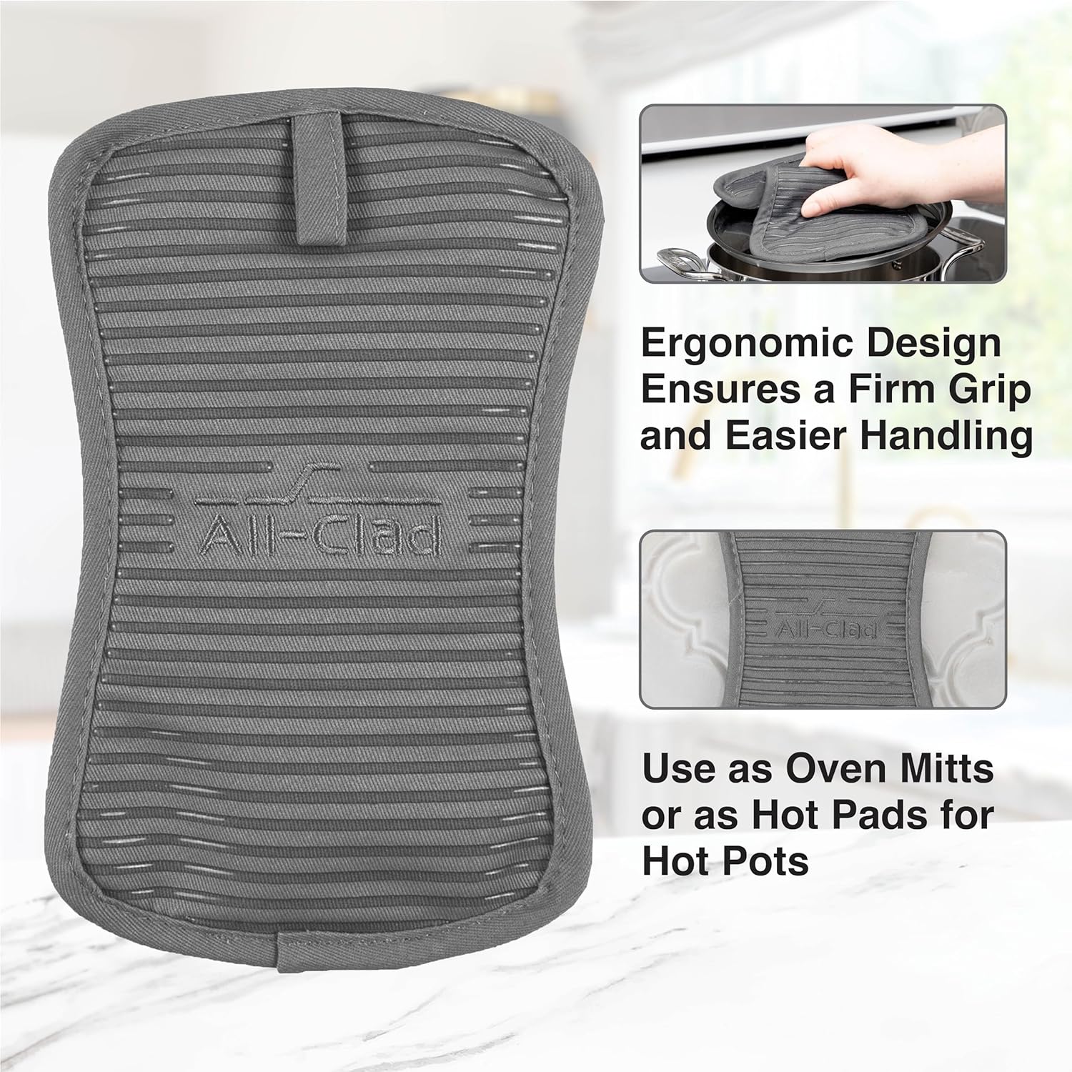 - MAXIMUM HEAT PROTECTION. All-Clad Pot holders with silicone grip offer heat resistance up to 500 degrees Fahrenheit (260 degrees Celsius). Having a reinforced thumb area made of fire resistant fibers means your hands will be protected when grabbing hot items from the oven or grill.