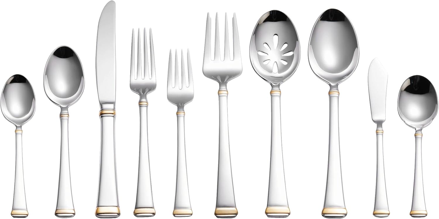 Mikasa Gold Accent Harmony Flatware Set for 12, 65 Piece 18/10 Stainless Steel Silverware with Gold-Trimmed Handles and Serving Utensils, Elegant Dinnerware Service