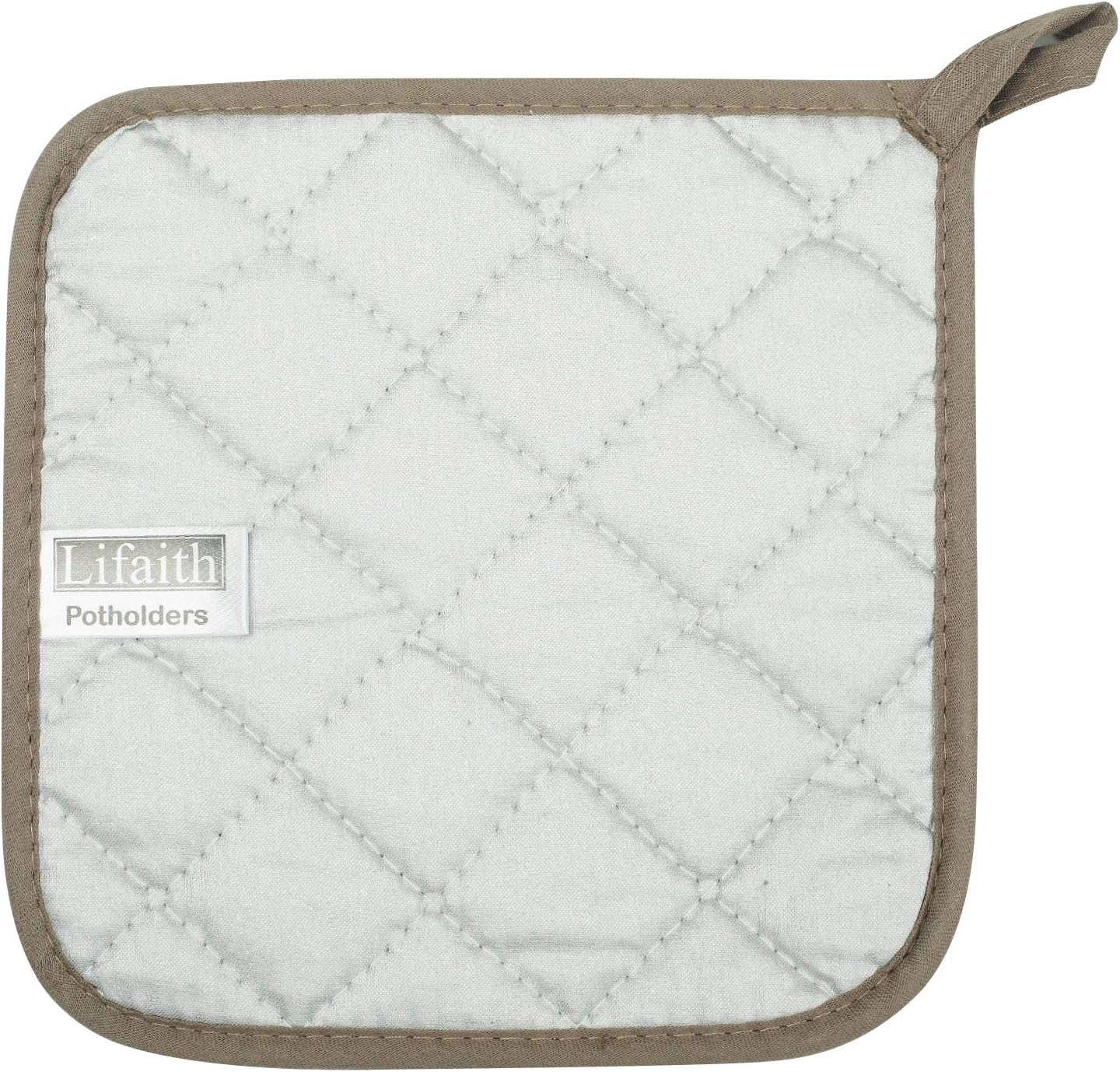 - 100% terry looped cotton on one side and a heat resistant silverstone lining on the other. Quilting allows for easy flexibility in this potholder, offer durability and grip. Hanging loop for easy storage.
