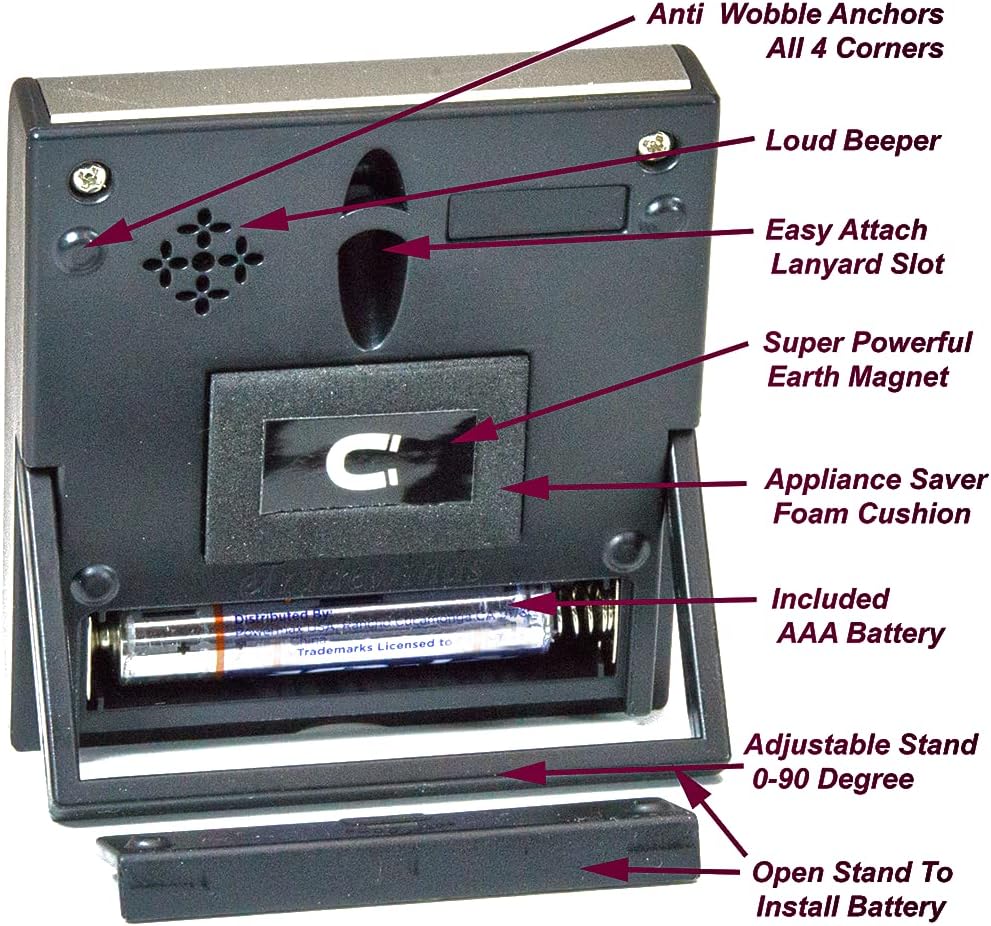 - Strongest Timer Magnet Listed Anywhere: Powerful Neodymium earth magnet & anti-scratch appliance saver foam. Our timers won't slide down your fridge or scratch appliances. Anti-Wobble Stabilizing Anchor Points: Designed on all 4 corners eliminating wobble, pivot, or movement when buttons are pressed while magnet secured. What good is a timer you can’t use while attached? This timer won't pop off your range hood and backflip into your boiling soup because you hit the off button. "No soup fer yu"