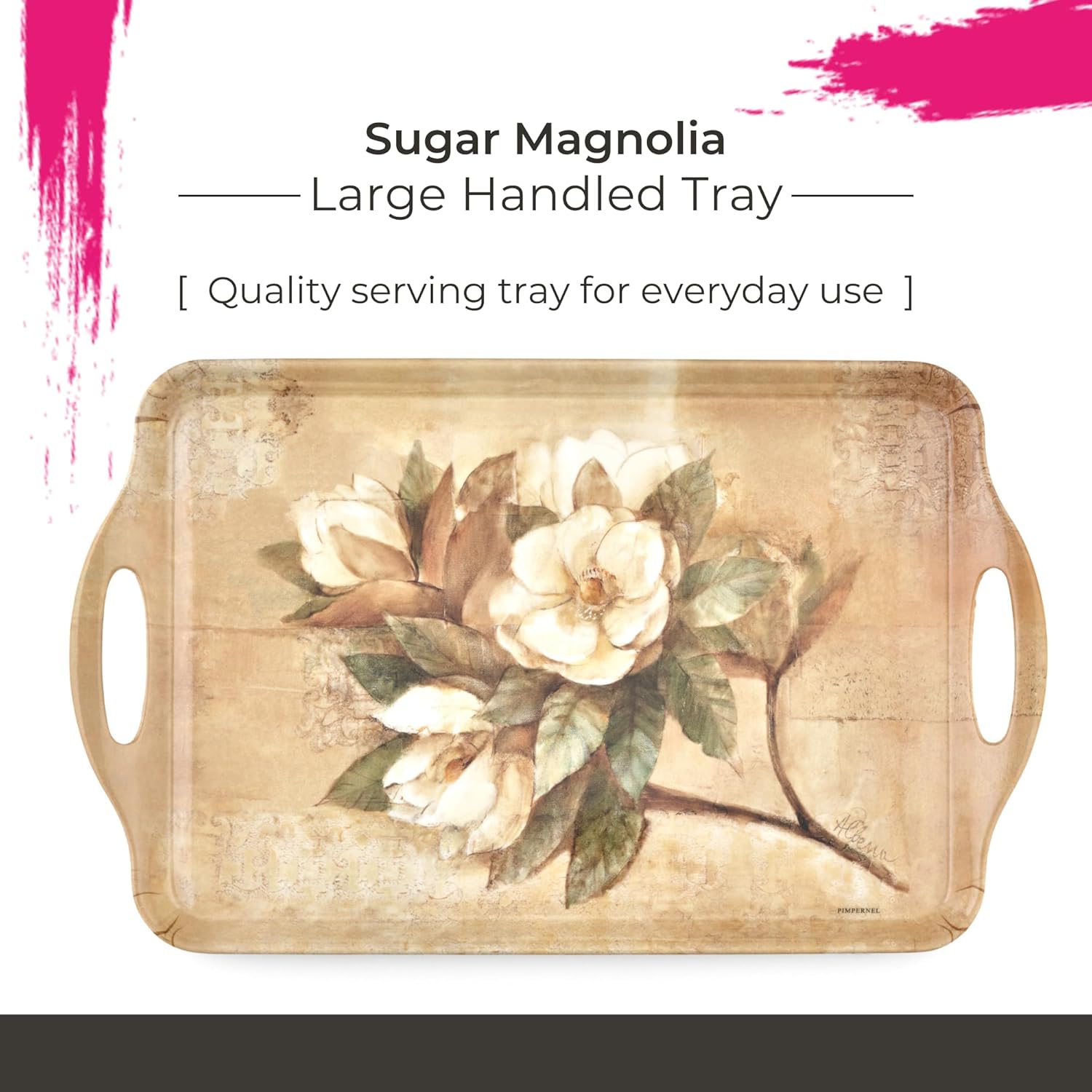 Pimpernel Sugar Magnolia Large Handled Tray - Rectangular Melamine Serving Tray with Bright Floral Magnolia Design & Side Handles - Dishwasher Safe Platter for Snacks Drinks/Decorative Table Display