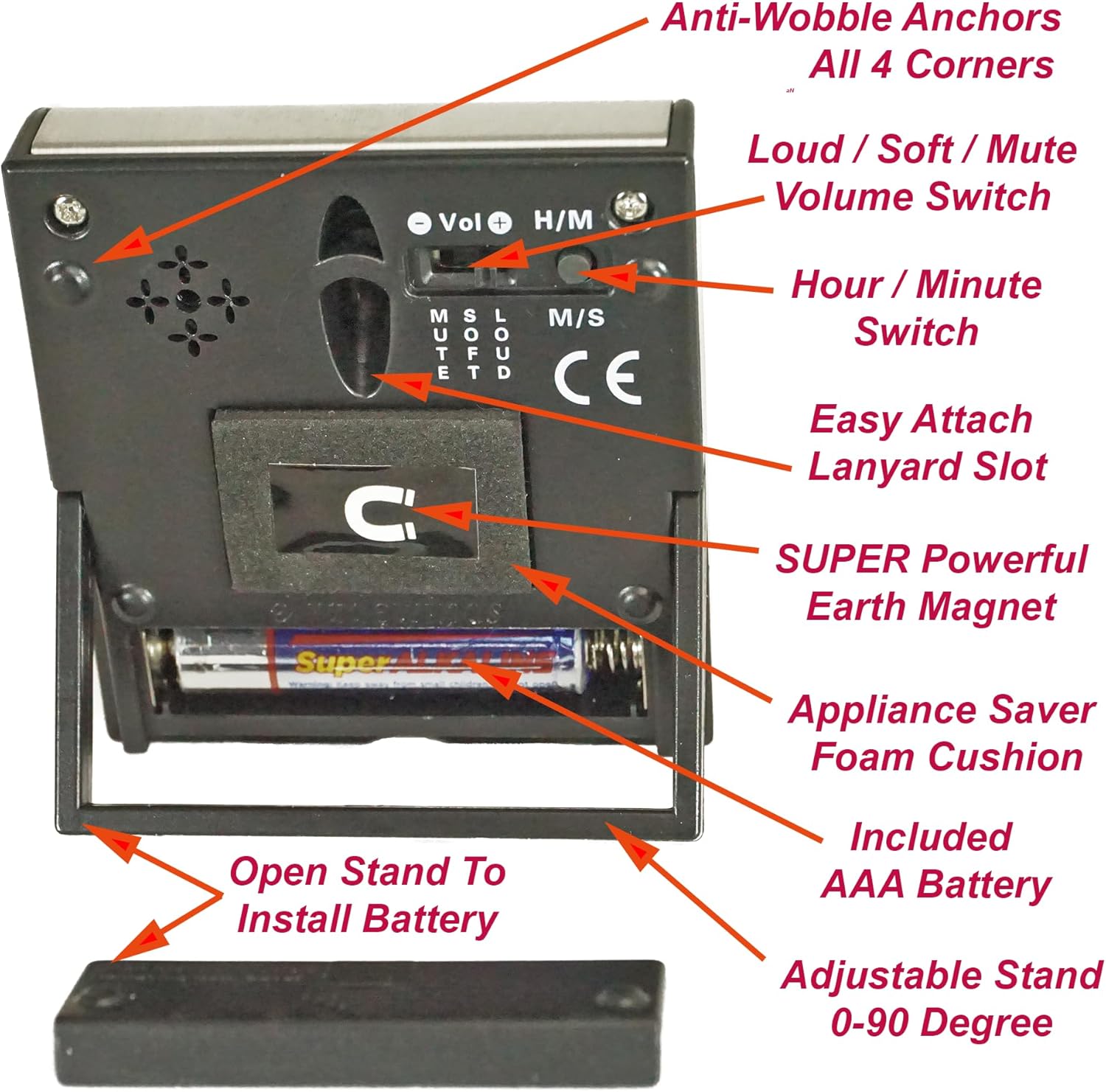 - Strongest Timer Magnet Listed Anywhere: Powerful Neodymium earth magnet & anti-scratch appliance saver foam. Our timers won't slide down your fridge or scratch appliances. Anti-Wobble Stabilizing Anchor Points: Designed on all 4 corners eliminating wobble, pivot, or movement when buttons are pressed while magnet secured. What good is a timer you can’t use while attached? This timer won't pop off your range hood and backflip into your boiling soup because you hit the off button. "No soup fer yu"