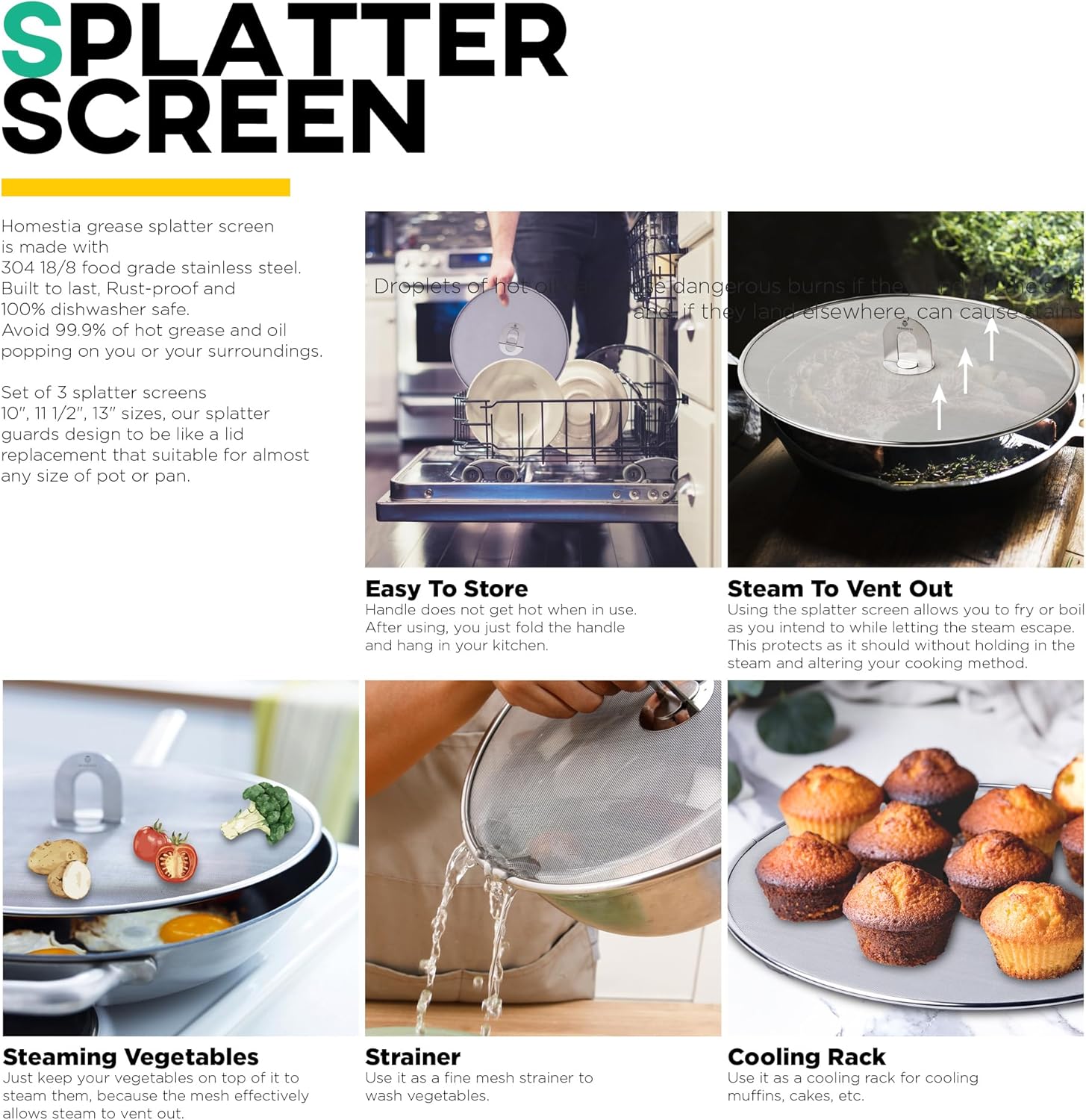 Homestia 11.5'' Splatter Screen for Cooking - Stainless Steel Grease Splatter Guard for Frying Pan, No Cooking Cover Oil Mess No Burns, Ultra Fine Mesh Lids for Sizzling Bacon or Popcorn