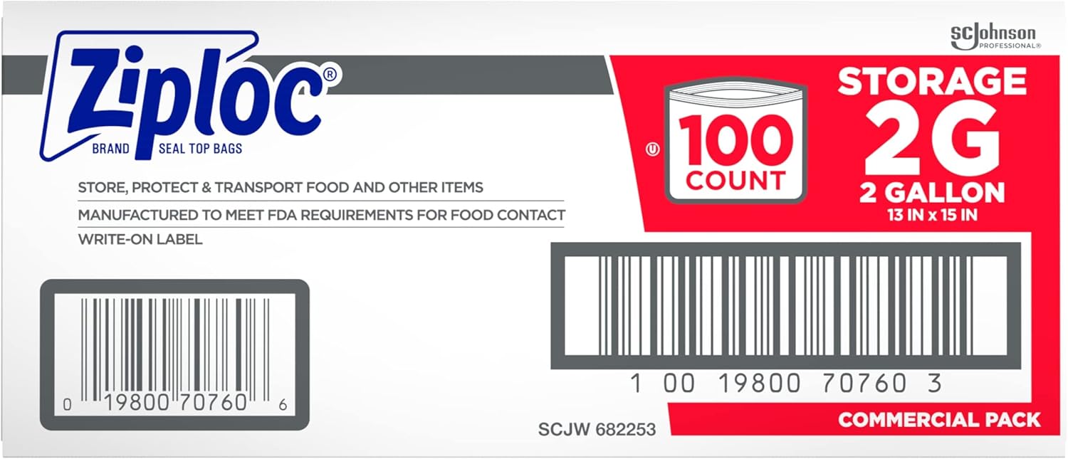 SC Johnson Professional Ziploc Storage Bags, For Food Organization and Storage, Double Zipper, 2 Gallon, 100 Count