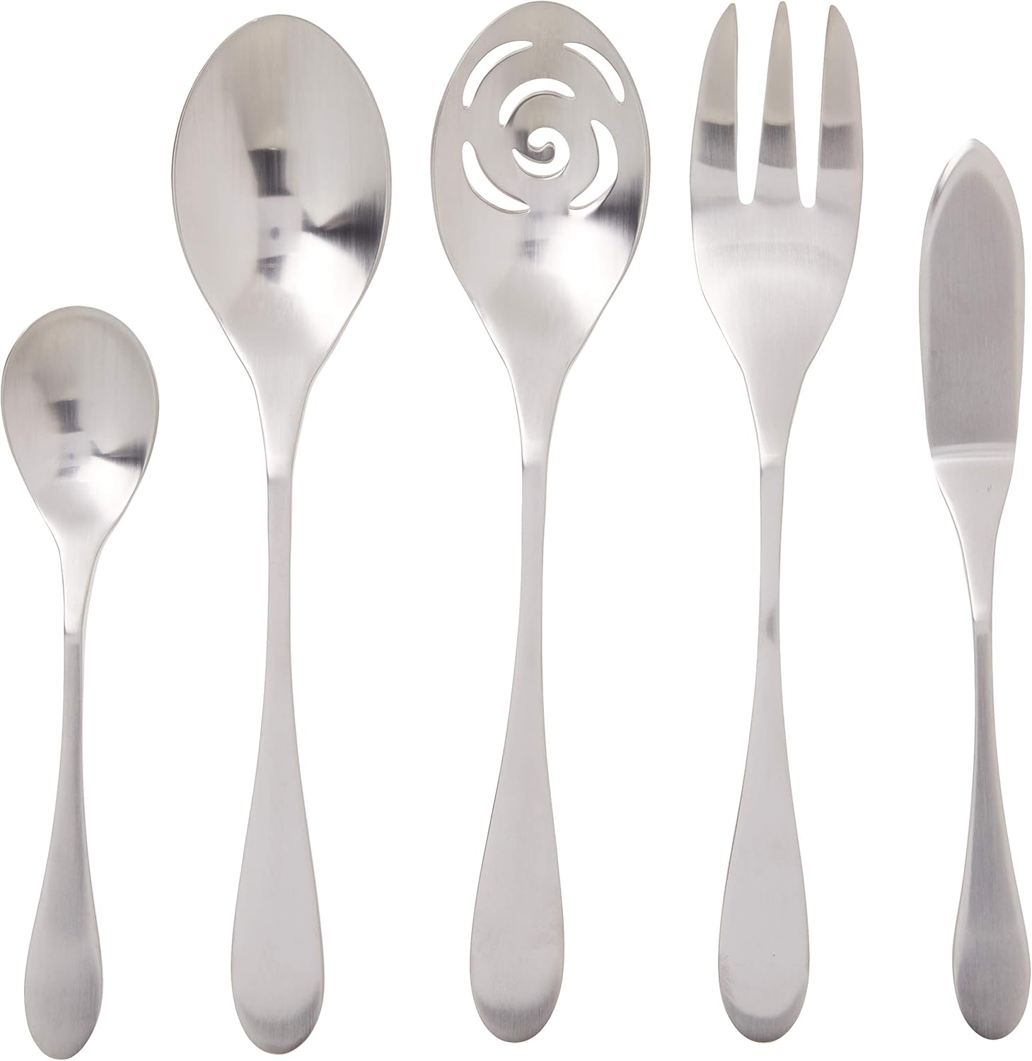 - Set includes: service for 8 plus a 5 piece serving set; 8 dinner knives, 8 dinner forks, 8 dinner spoons, 8 salad forks, 8 tea spoons, 1 serving spoon, 1 slotted spoon, 1 meat Knork fork, 1 sugar spoon, 1 butter knife