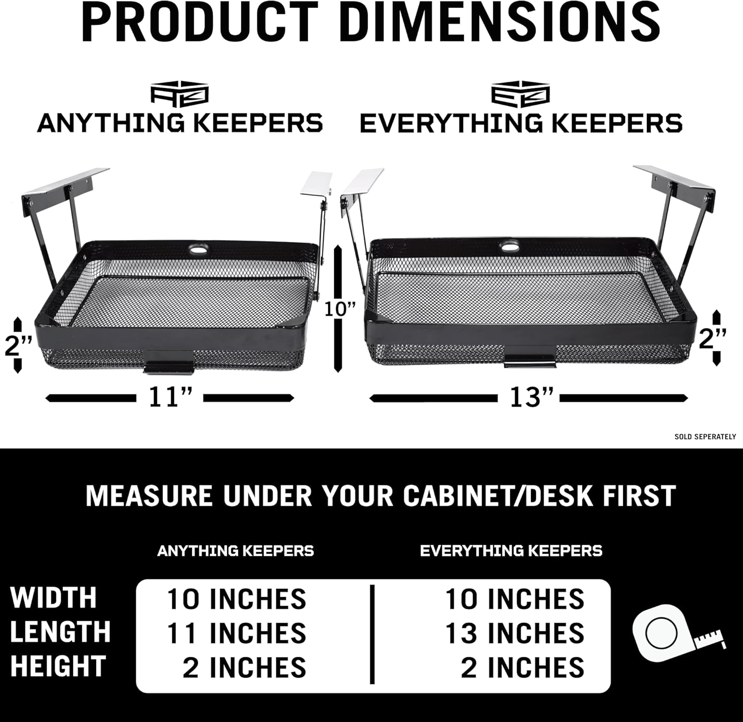 - MAXIMIZE SPACE WITH UNDER CABINET STORAGE: Declutter and organize your home, office, or RV with the Everything Keeper under cabinet. Its pull-down shelf design gives you instant access to your essentials while saving valuable space beneath cabinets, desks, and shelves. Perfect for storing wallets, phones, keys, and everyday items, this sleek organizer keeps your countertops and workspaces free of clutter. Whether in your kitchen, bathroom, or office, it provides an elegant, space-saving solution.