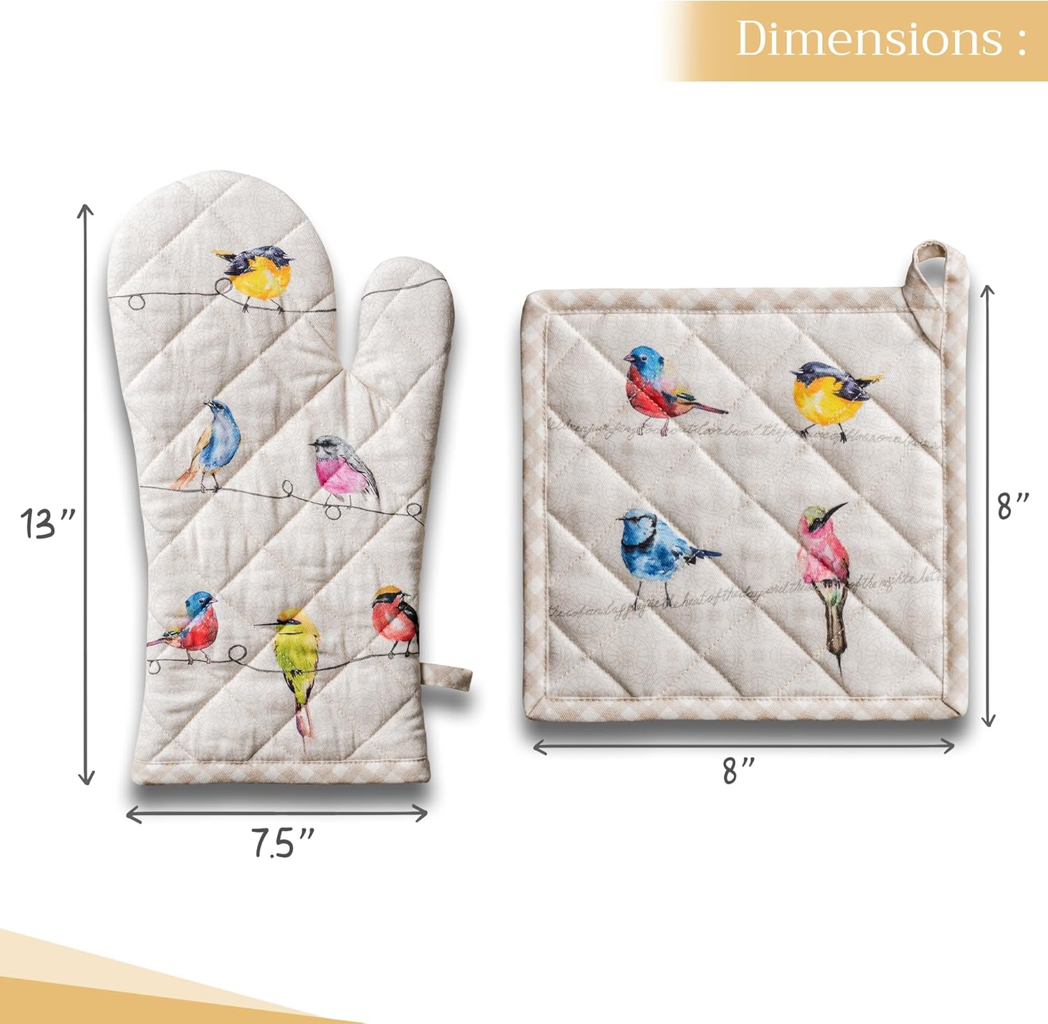 Maison d' Hermine 100% Cotton Oven Mitt & Pot Holder Set (7.5"x13" & 8"x8") Heat Resistant BBQ Cooking Gloves with Loop, Baking, Grilling, Kitchen, Handling Hot Pans Spring/Summer (Birdies On Wire)