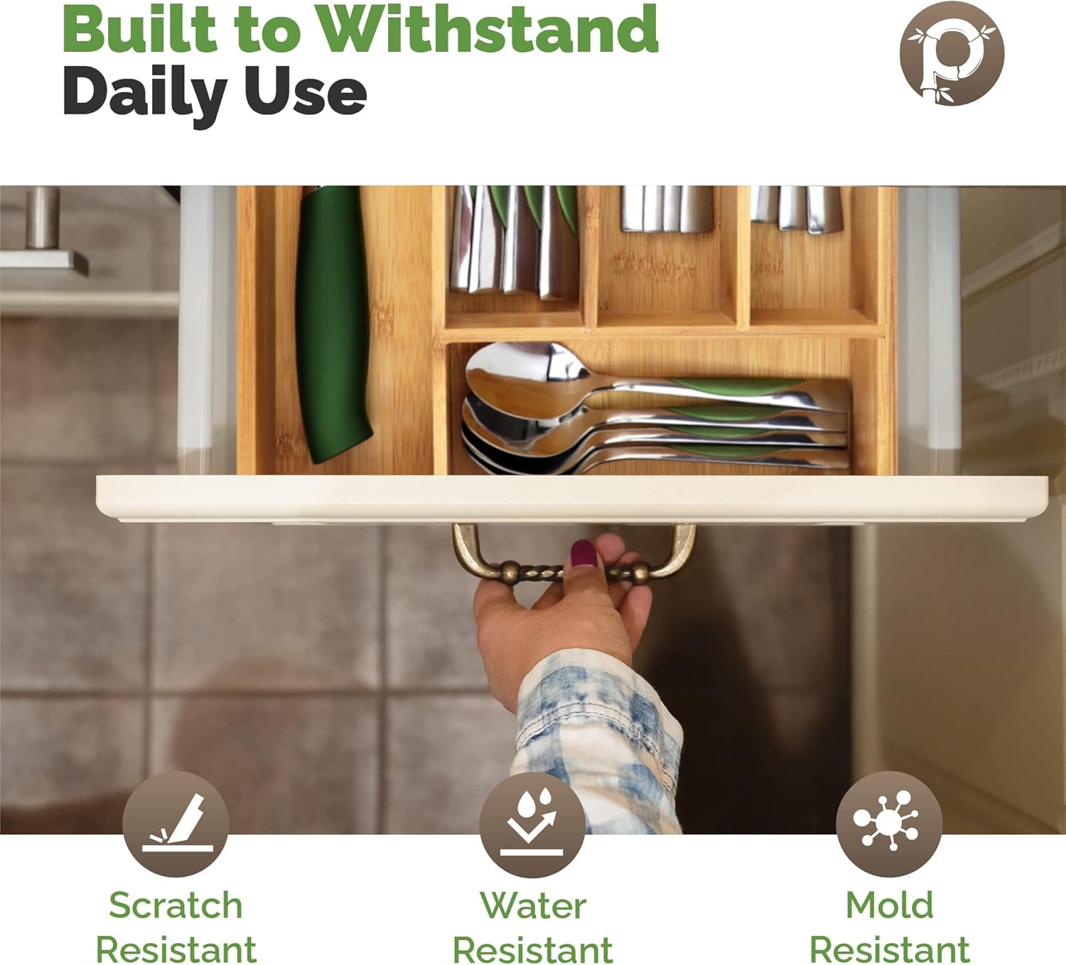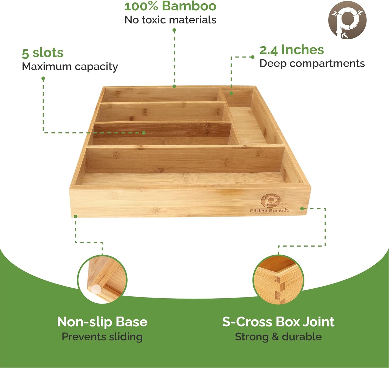 - SLIP RESISTANT & DEEPEST in the market: The only silverware drawer organizer that is slip-resistant and 2.4" deep. This deep silverware tray Increases storage capacity in your kitchen drawer to best fit a variety of utensils (internal depth 2”). The non-slip silicone feet keep your bamboo utensil holder in place. So don’t worry, your flatware organizer tray will not move to the back of the drawer ever.