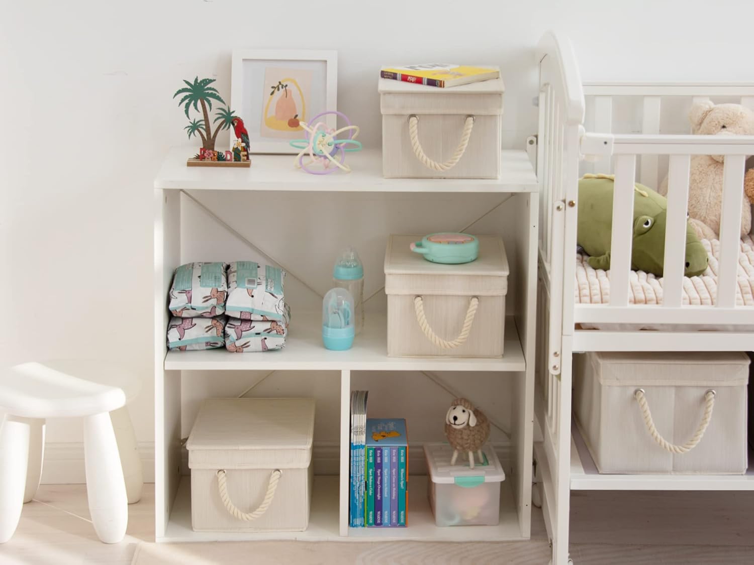 - Thick fabric storage boxes with lids reinforced with heavy-duty boards.