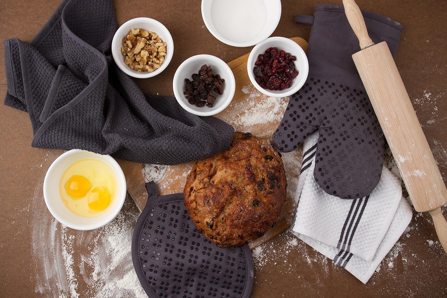 Sticky Toffee Oven Mitt and Pot Holder Set of 3 – Gray Non-Slip Kitchen Hot Pads and Mitts with Silicone Grip, 100% Cotton Shell, Oeko-Tex Cotton