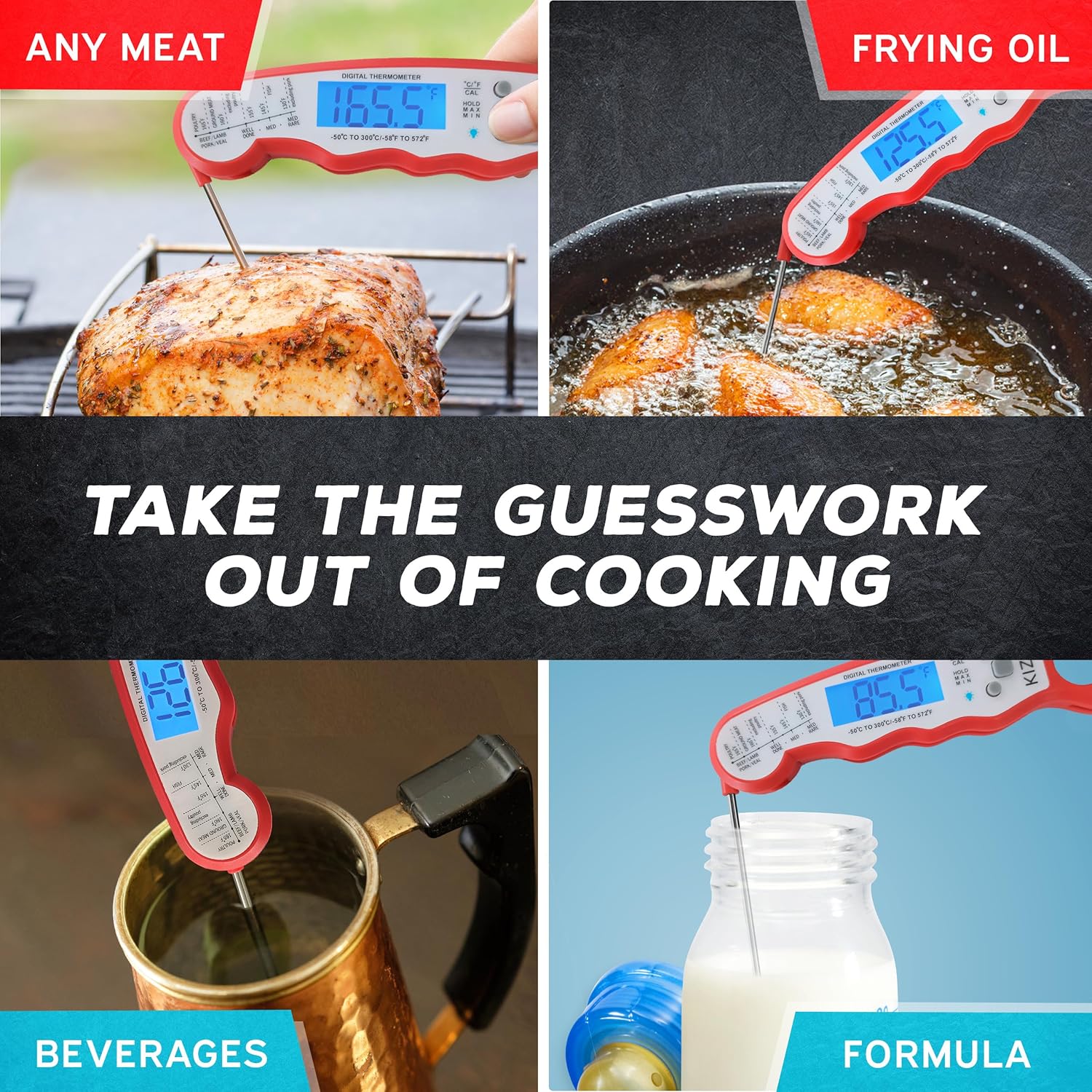 - EASY TO READ - Perfect for the kitchen or grilling at night, our digital cooking thermometer displays the temperature of your food or liquid on a large, backlit LED screen.