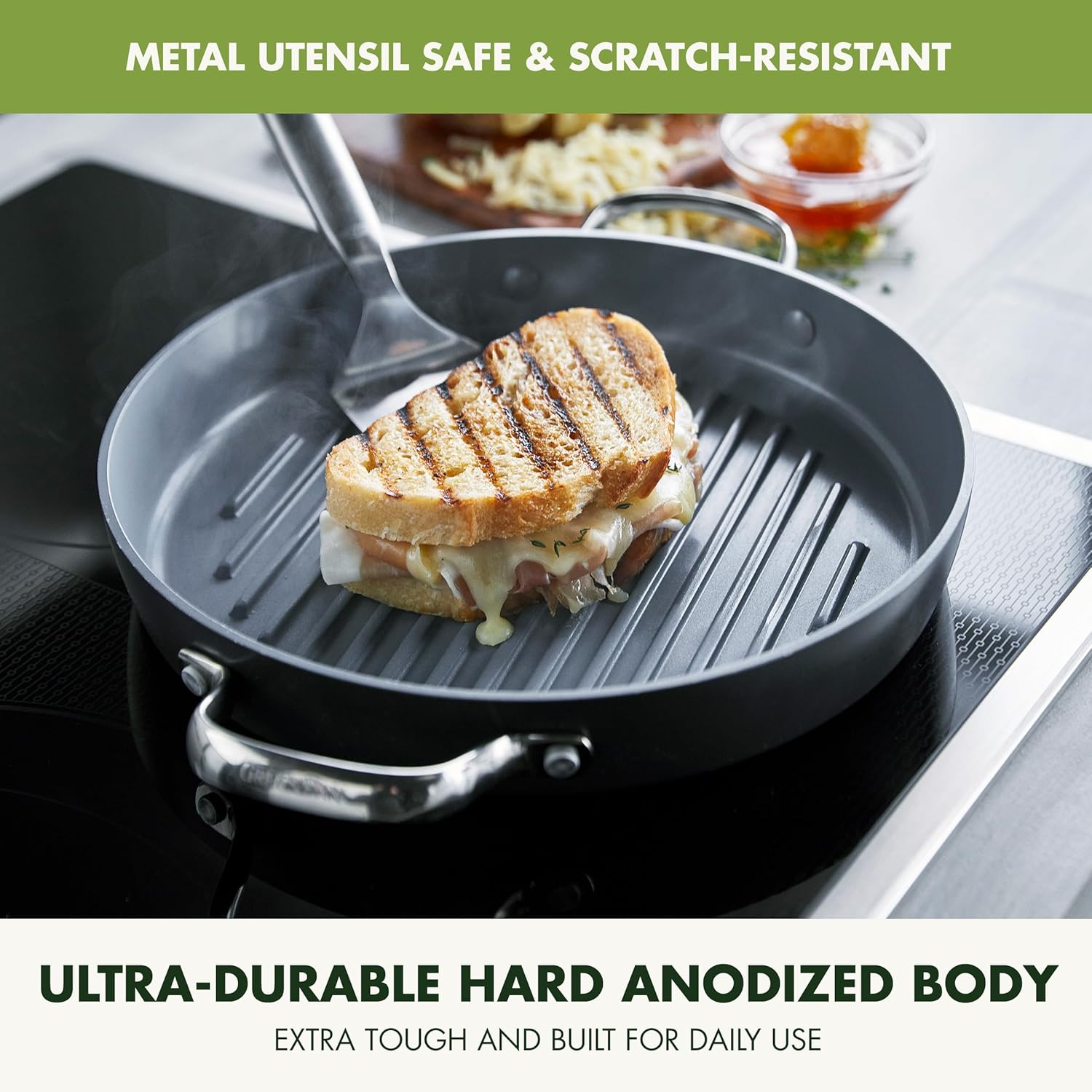 - CUTTING-EDGE CERAMIC NONSTICK: Infused with diamonds, GreenPan's metal utensil safe ceramic nonstick offers remarkable durability, balanced heating, and effortless cleanup.