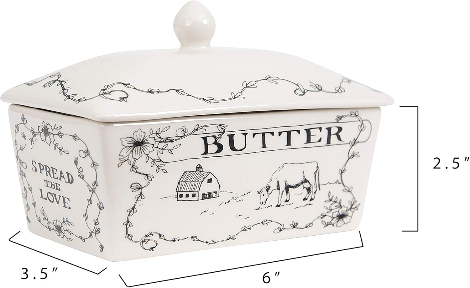 Creative Co-Op Country Stoneware Butter Dish with Lid, "Spread the Love" Message, and Farm Line Drawing, White and Black, Food, Microwave, and Dishwasher Safe