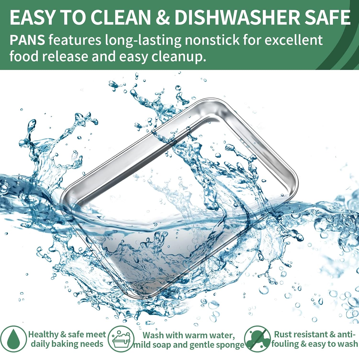 - 【Easy Clean & Leak-Proof & Nonstick 】-- Nonstick stainless steel baking pans tray keep food contained and prevent food juice flowing everywhere, Keeping your oven neat. Dishwasher can save your time and labor after using.Easy to clean up even in hand-wash. Stainless steel cookies pan features long-lasting nonstick for excellent food release and easy cleanup.