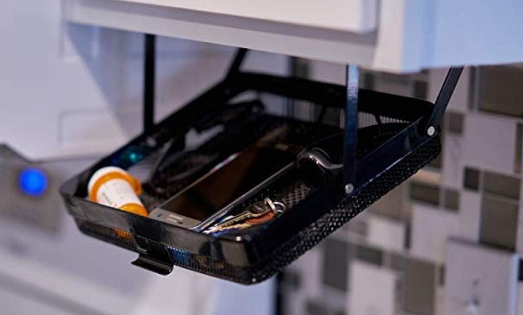 - Ingenious Storage Solution: An ideal compact size, our patented Everything Keeper provides a sturdy permanent storage container in your home, office, cabin, RV, & other busy areas. Perfect for use at everyday workstations, the tasteful black mesh movable basket hangs in reaching distance for essentials like pens, paperwork, computer accessories, and personal items. The interior holder measures 12” x 10” x 2.5” & includes a slip-resistant mat, making it extra user-friendly.