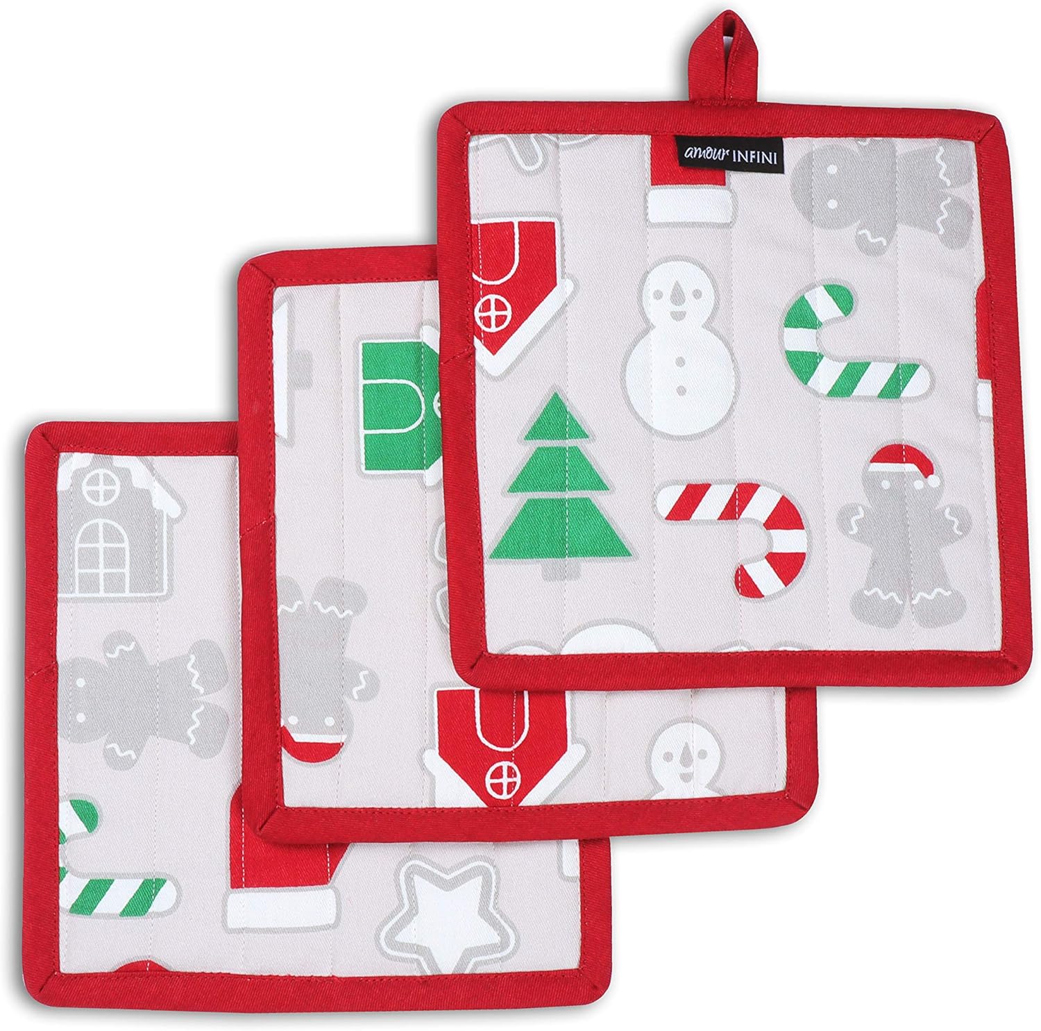 AMOUR INFINI Pot Holders Heat Resistant Cotton Set of 3 Nonslip 8"x8" Inch Hot Pads for Kitchen, BBQ, Baking & Cooking with Hanging Loops (Christmas Fun)