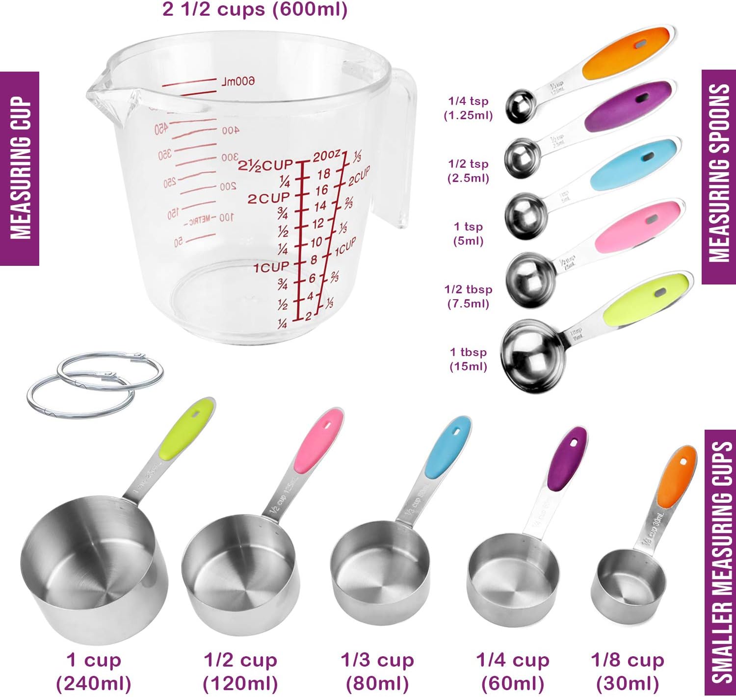 - MULTIPLE SIZES: Meet all your needs on cooking and baking. Includes 5 stainless steel measuring cups (1/8 cup, 1/4 cup, 1/3 cup, 1/2 cup, 1 cup) 1 plastic transparent measuring cup (2 1/2 cups) and 5 stainless steel measuring spoons (1/4 tsp, 1/2 tsp, 1 tsp, 1/2 tbsp, 1 tbsp)