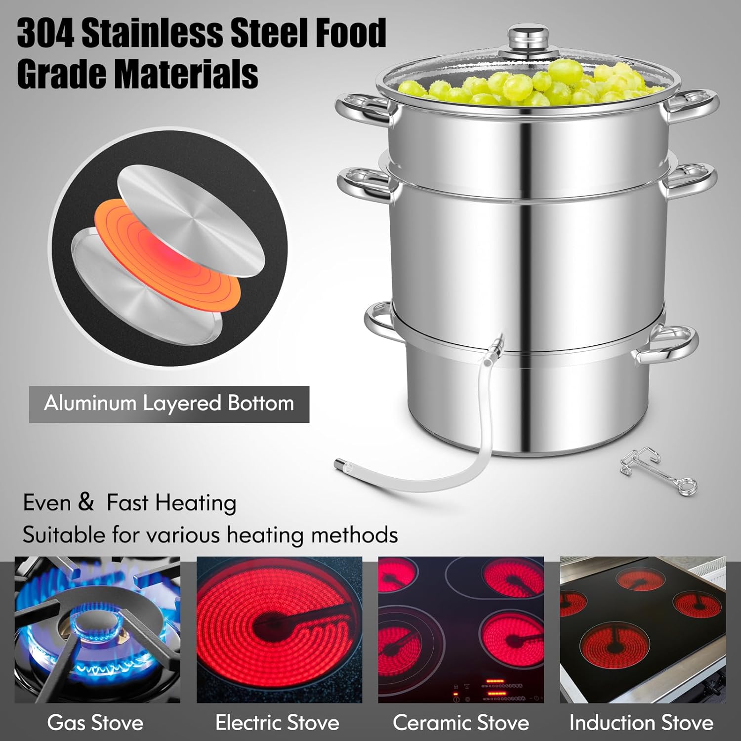 Giantex 11 Quart Juice Steamer Fruit Vegetables Juicer Steamers w/Tempered Glass Lid, Hose, Clamp, Loop Handles Stainless Steel Steam Juicer Multipots Kitchen Cookware for Making Juice, Jelly, Pasta