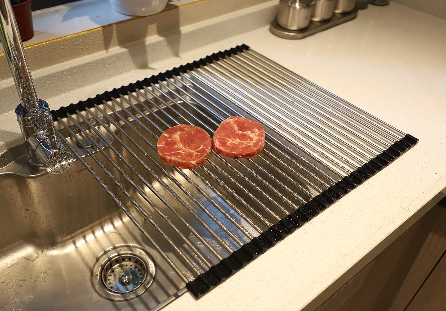 - Roll up Sink Drying Rack and Spacing-saving Dish Drying Mat: This dish drainer can roll up and go in a drawer quickly when not in use. Works great and keeps the kitchen sink area looking neat, the best one of dish drainers for kitchen counter. You can roll up this over the sink dish drying rack as much as you like during using it and for the pipes also can be removable