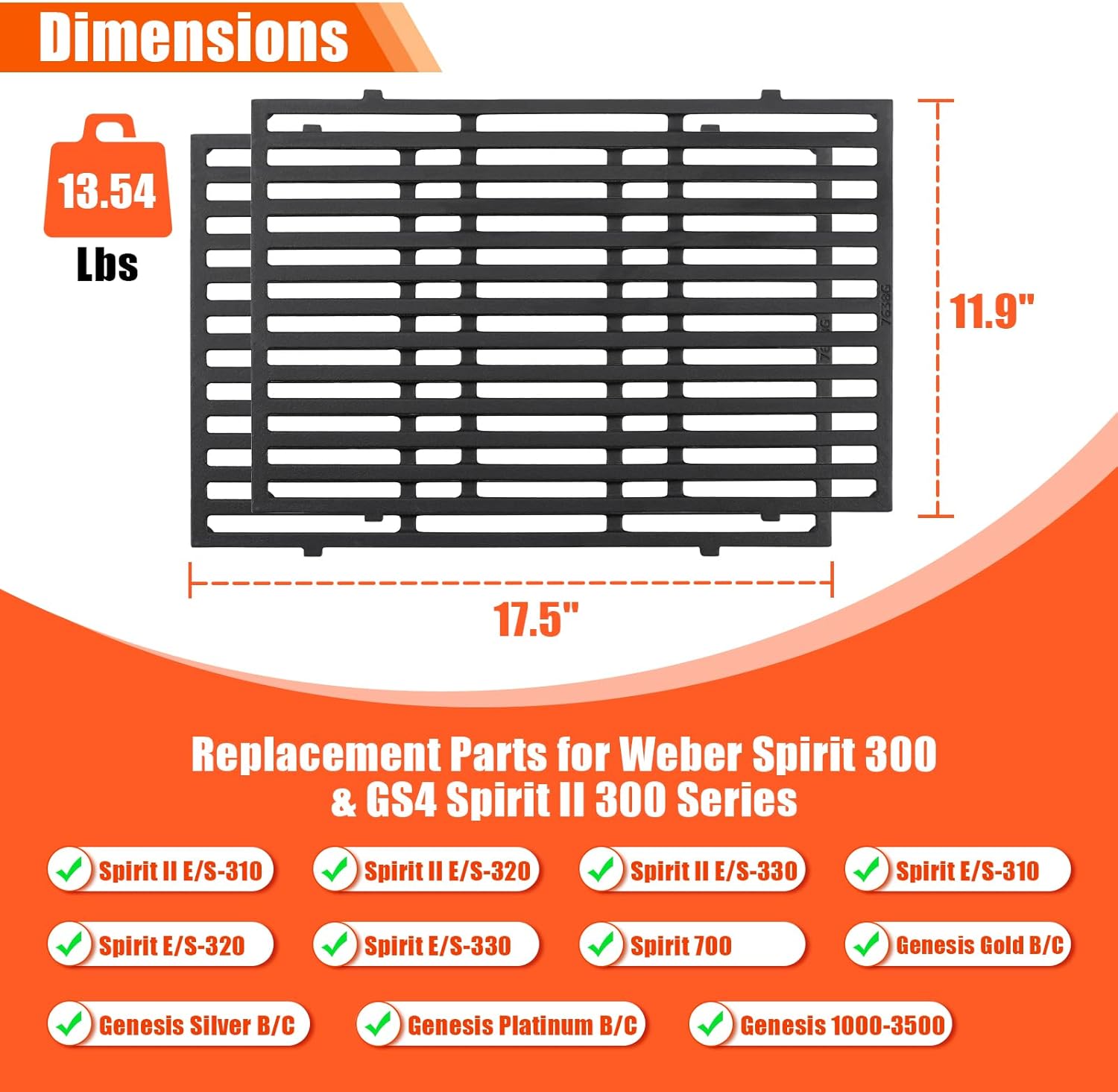 QuliMetal 17.5" Grill Grates for Weber Spirit 300 and Spirit II 300 Series, Spirit E/S-310 E/S-320 E/S-330, Spirit 700, Genesis Silver/Gold B & C, Genesis 1000-3500, Cast Iron Part for Weber 7638 7639