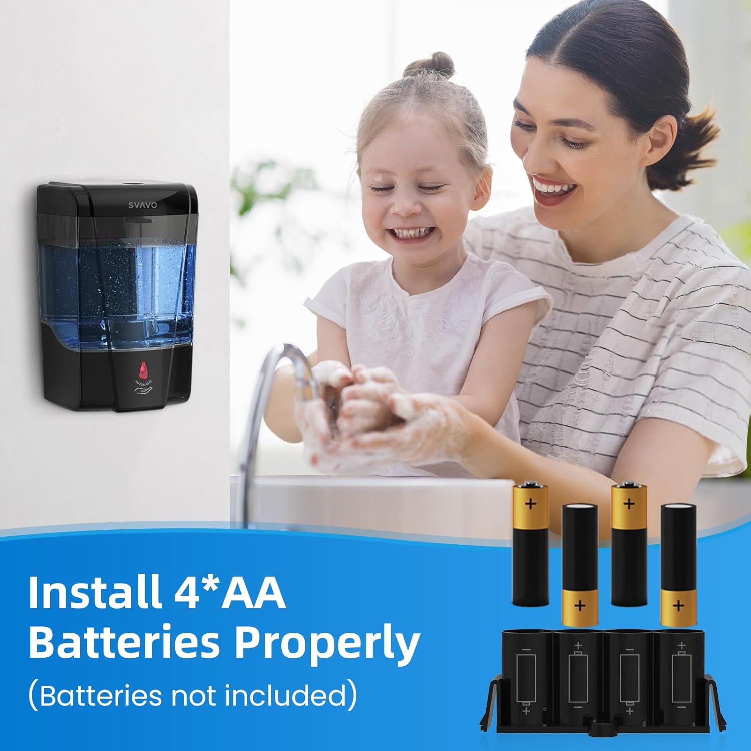 - ✔️ [Space Saving & Energy Efficiency] The wall-mounted soap dispenser features save space on a confined vanity; The mount design allows you to save countertop space naturally-Small Footprint and Large Capacity. 4 AA-size batteries (not included) will allow you to enjoy hands-free soap dispensing for up to a year before having to change batteries, not over consume battery.