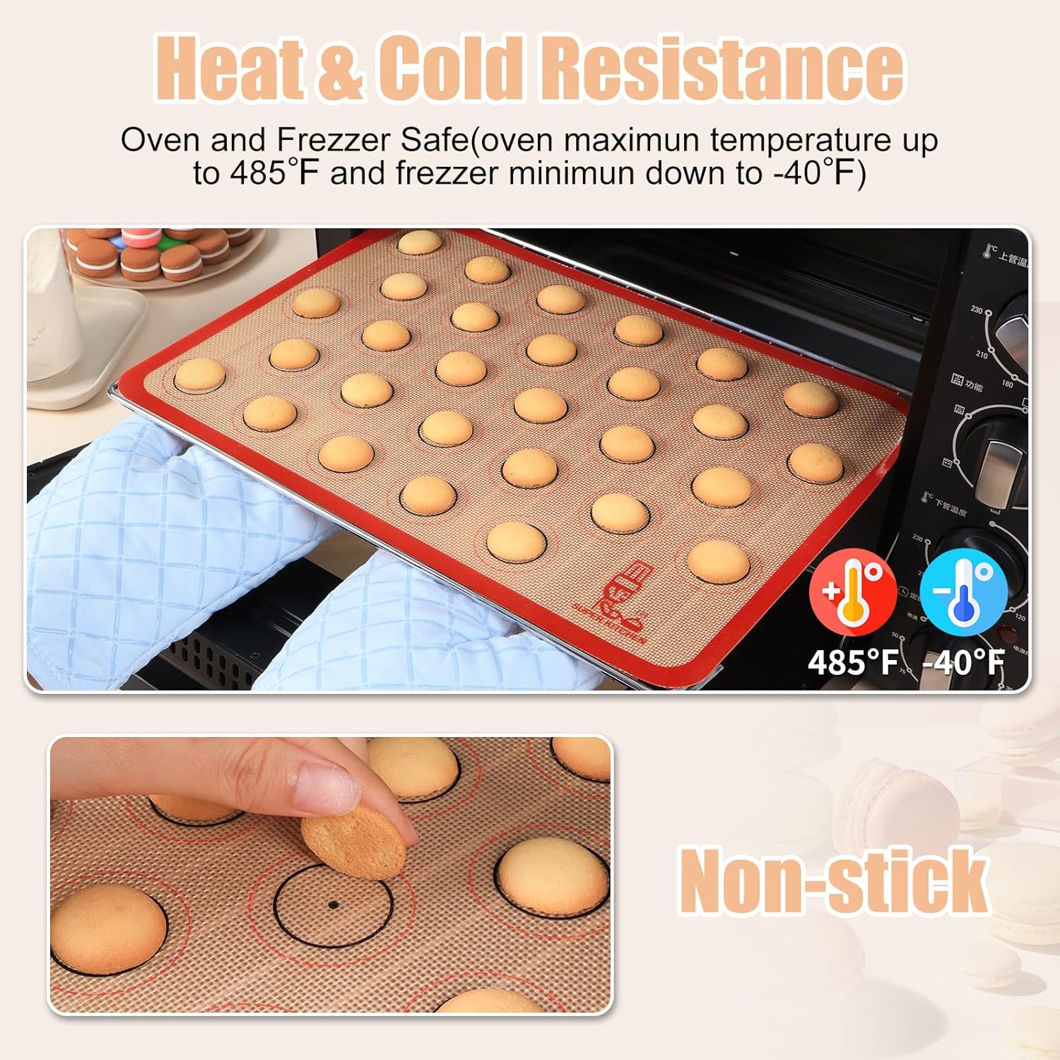 - Thicker Design for Macaron Cookie Baking Mats: The bigger red nonstick silicone macaroons baking sheet are in 16.5x11.6 inch .The small red liner is 11.8x8.3inch. The silicone mat thickness is 0.75 mm design. It is much durable and long lasting.