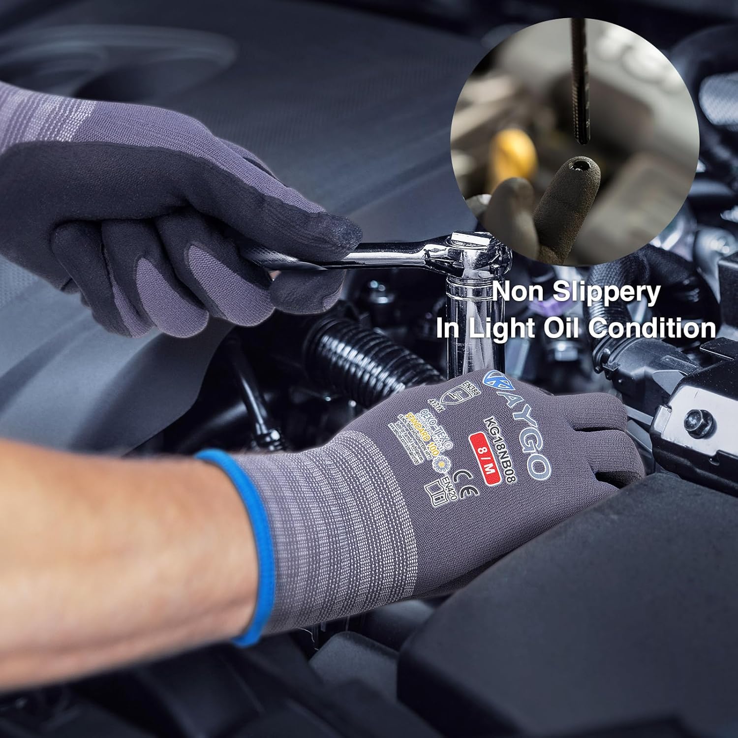 KAYGO Safety Work Gloves MicroFoam Nitrile Coated, 12 Pairs KG18NB,Seamless Knit Nylon Glove for Men and Women, Ideal for Automotive,Warehouse,Construction (X-Large,Gray)