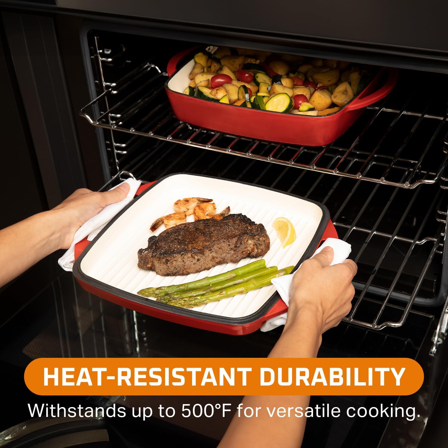 Bruntmor 2-in-1 Square Enameled Cast Iron Dutch Oven Baking Pan and Gridle Lid with Dual Handles, Cast Iron Skillet lid, Coating Gridle for Baking, Bacon,Steaks - Red