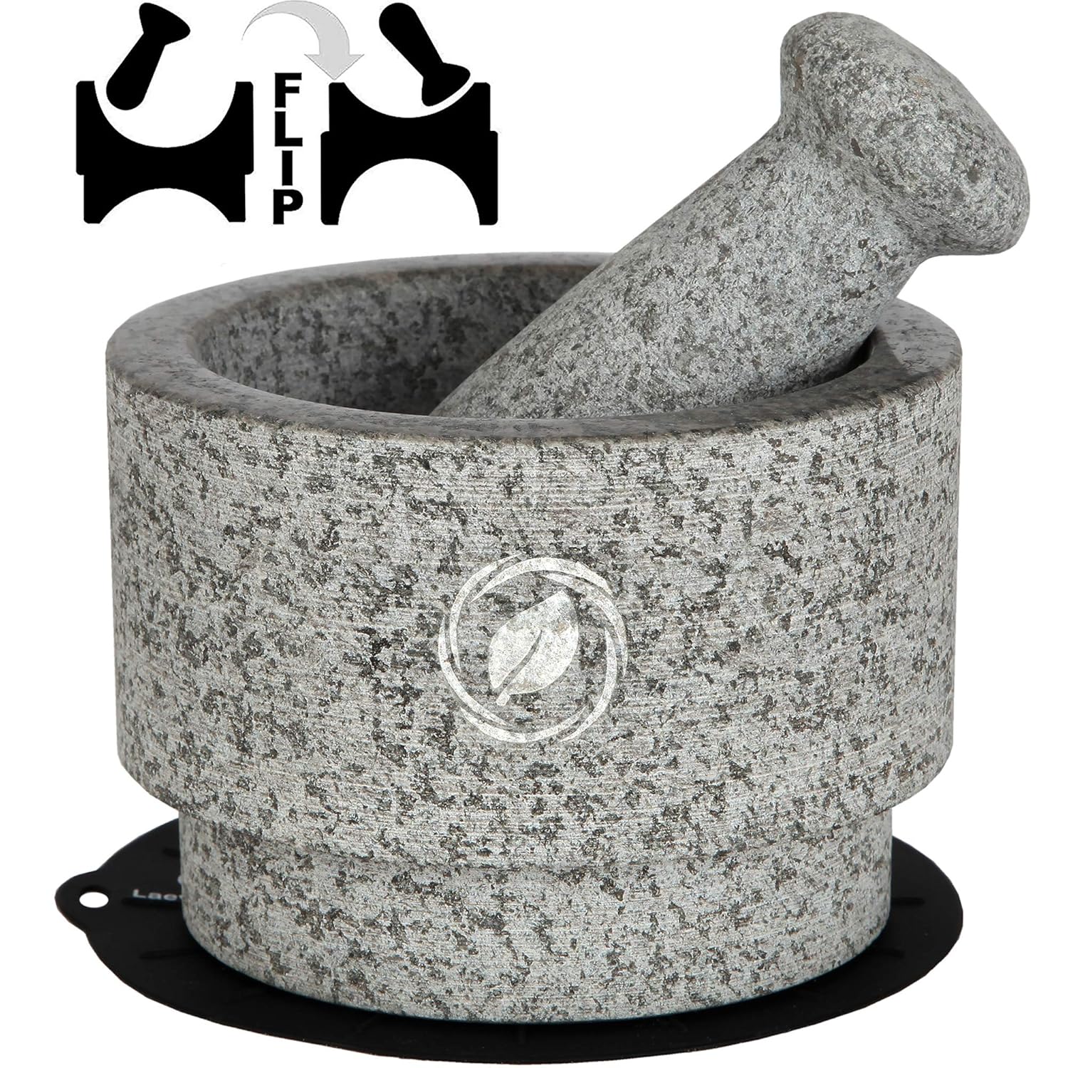 - Granite Pestle and Mortar Set: This solid granite mortar features a reversible design and large 2.1 cup capacity. Ideal for grinding spices, herbs, and more with your double sided mortar and pestle