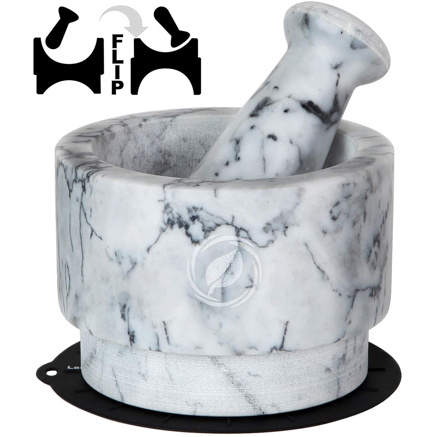 Laevo White Marble Mortar and Pestle Set - Heavy Duty Stone Spice Grinder - 2.1 Cup Capacity, 5.5-Inch Reversible Mortar and Pestle Set for Guacamole, Pesto, Spices - Large