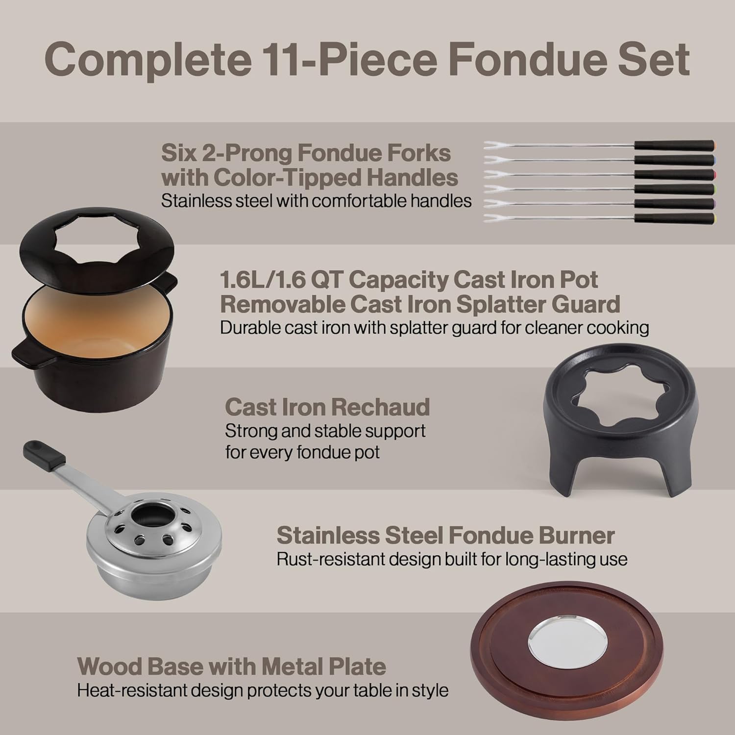 - Complete 12-Piece Set: Includes a 1.6 quarts / 1.6 Liter pot with handles, 6 color-tipped forks, splatter ring, rechaud, paste / gel fuel burner, and a grooved wooden base for stable serving. Perfect for hosting memorable fondue nights with friends and family.
