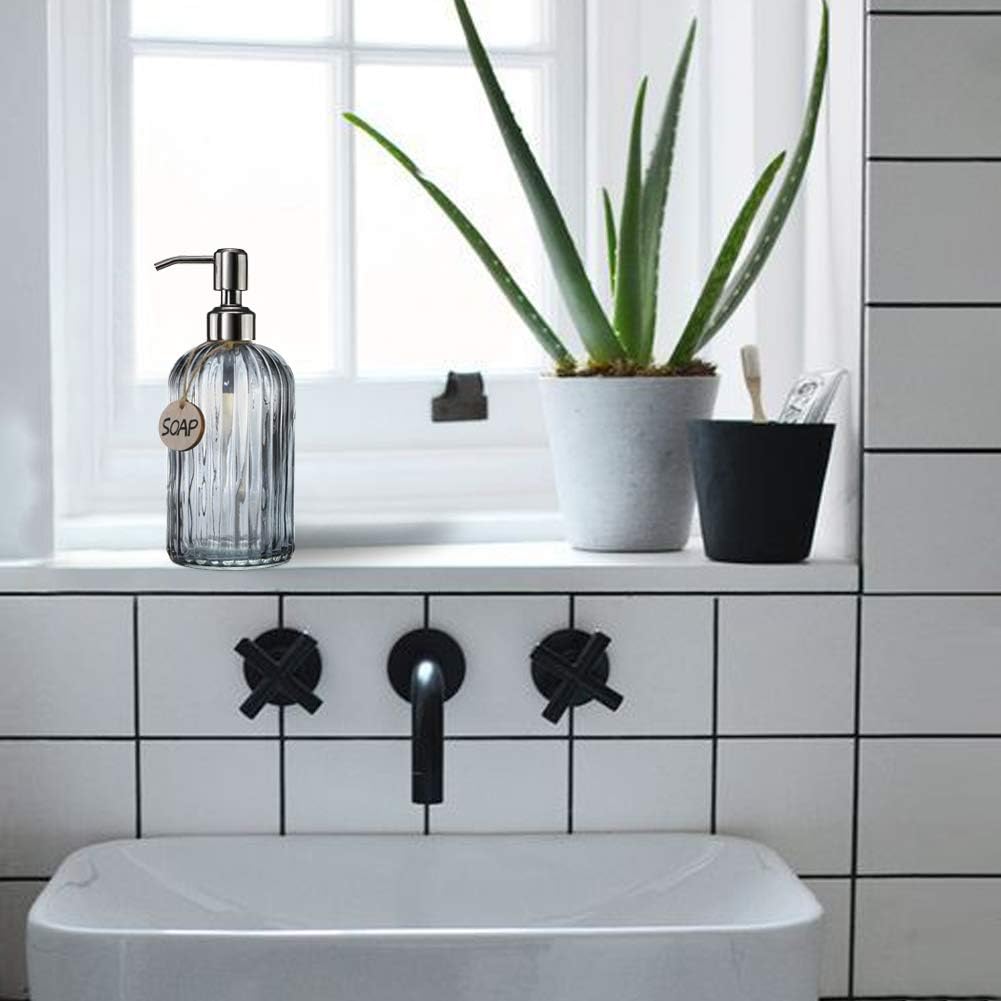 JASAI 18 Oz Vertical Stripes Kitchen Soap Dispenser with 304 Rust Proof Stainless Steel Pump, Refillable Liquid Soap Dispenser for Bathroom, Kitchen, Hand Soap, Dish Soap (Clear Grey)
