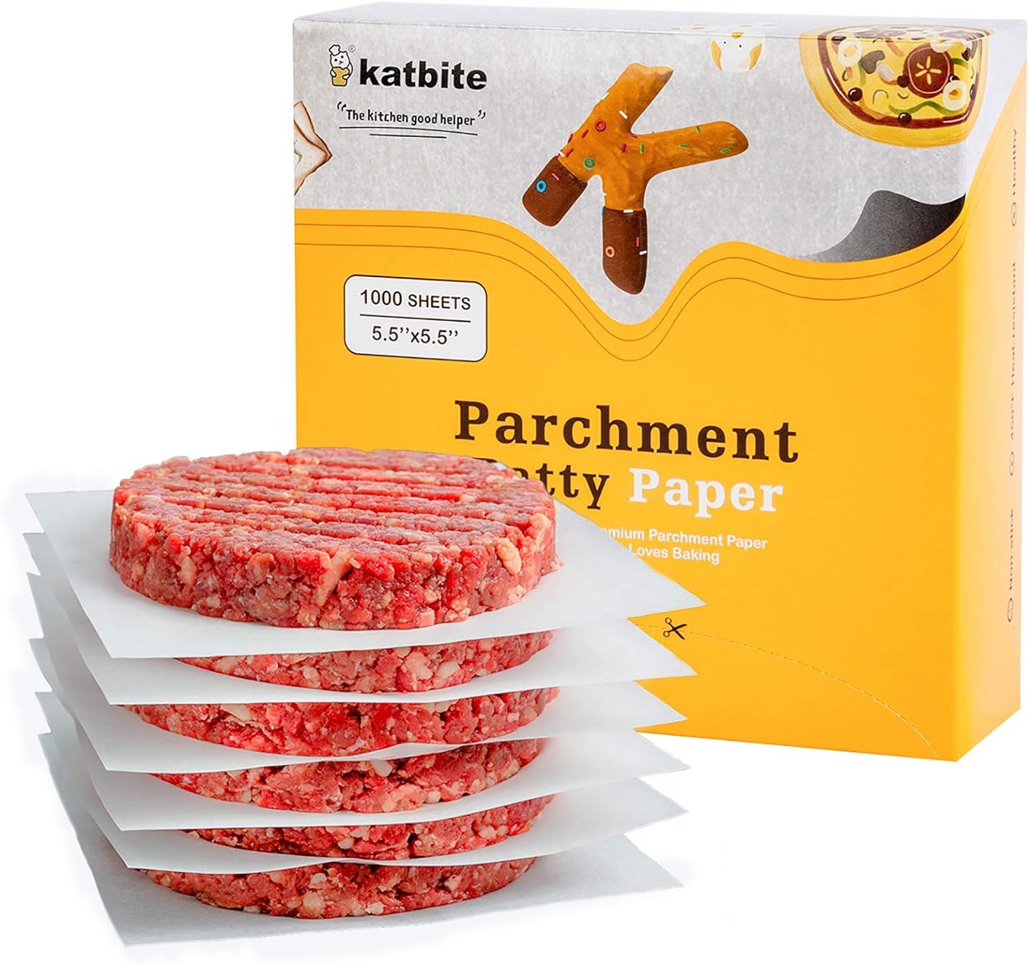 - HEALTHY & NON-TOXIC - Katbite patty paper 1000 sheets 5.5”x5.5”, made from natural 100% wood pulp and totally fluorescent free. Safety Certificate approved. Unwaxed, designed with two-side food grade silicone coating, makes your baking safe and non-toxic.