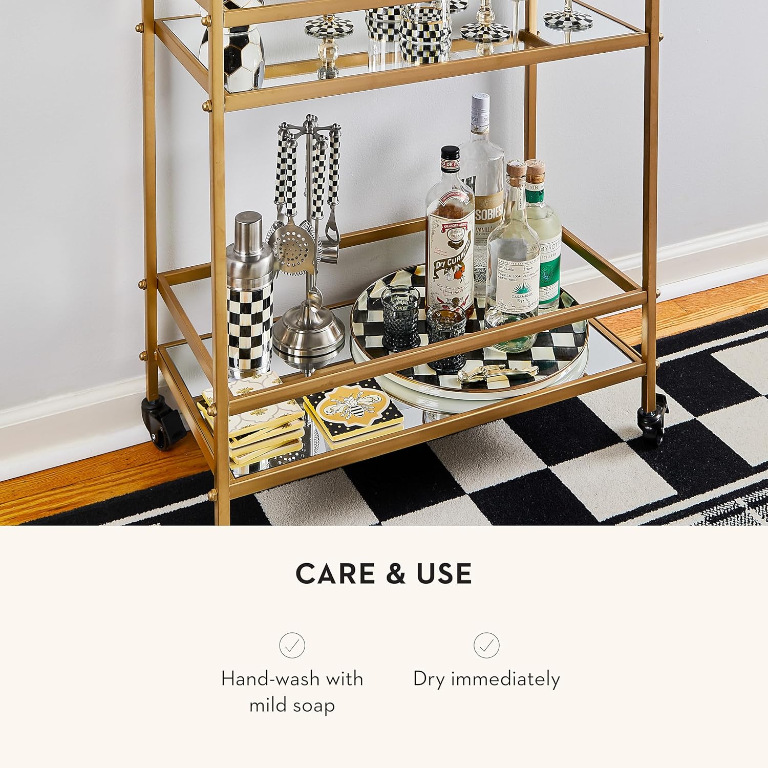 - ELEGANT SERVING ESSENTIAL: Serve anything in style with the Courtly Check round decorative tray, featuring a classic jewel-toned palette woven by an artisan’s brush through glossy hand-painted black-and-white checks on a sturdy steel base.