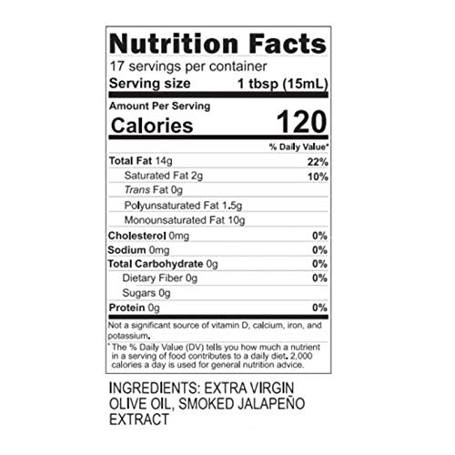 - Cold Pressed Extra Virgin California Olive Oil infused with smoked jalapeno.