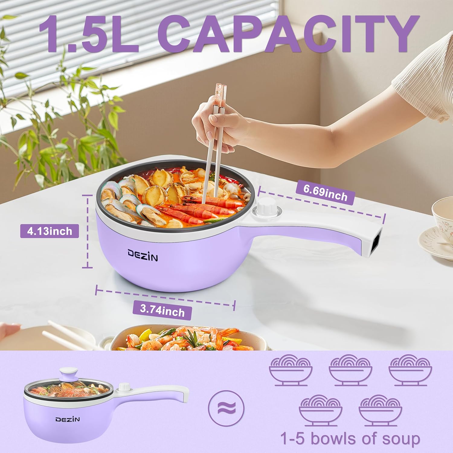 Dezin Hot Pot Electric Upgraded, Non-Stick Sauté Pan, Rapid Noodles Electric Pot, 1.5L Mini Portable Hot Pot for Steak, Egg, Fried Rice, Ramen, Oatmeal, Soup with Power Adjustment