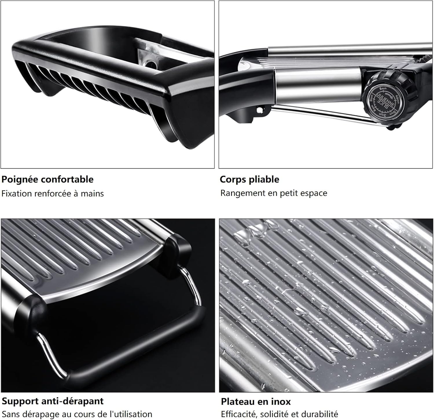 - High Quality:The blade of mandoline slicer is very sharp. It is made of high quality stainless steel with sharp edge and hard texture. The heavy and sturdy stainless steel frame is more durable than ordinary plastic slicer, easy to cut vegetable slicer, fruit cutter, potato chips, cucumber, carrot slices and onion rings. It is a good helper for making salad.