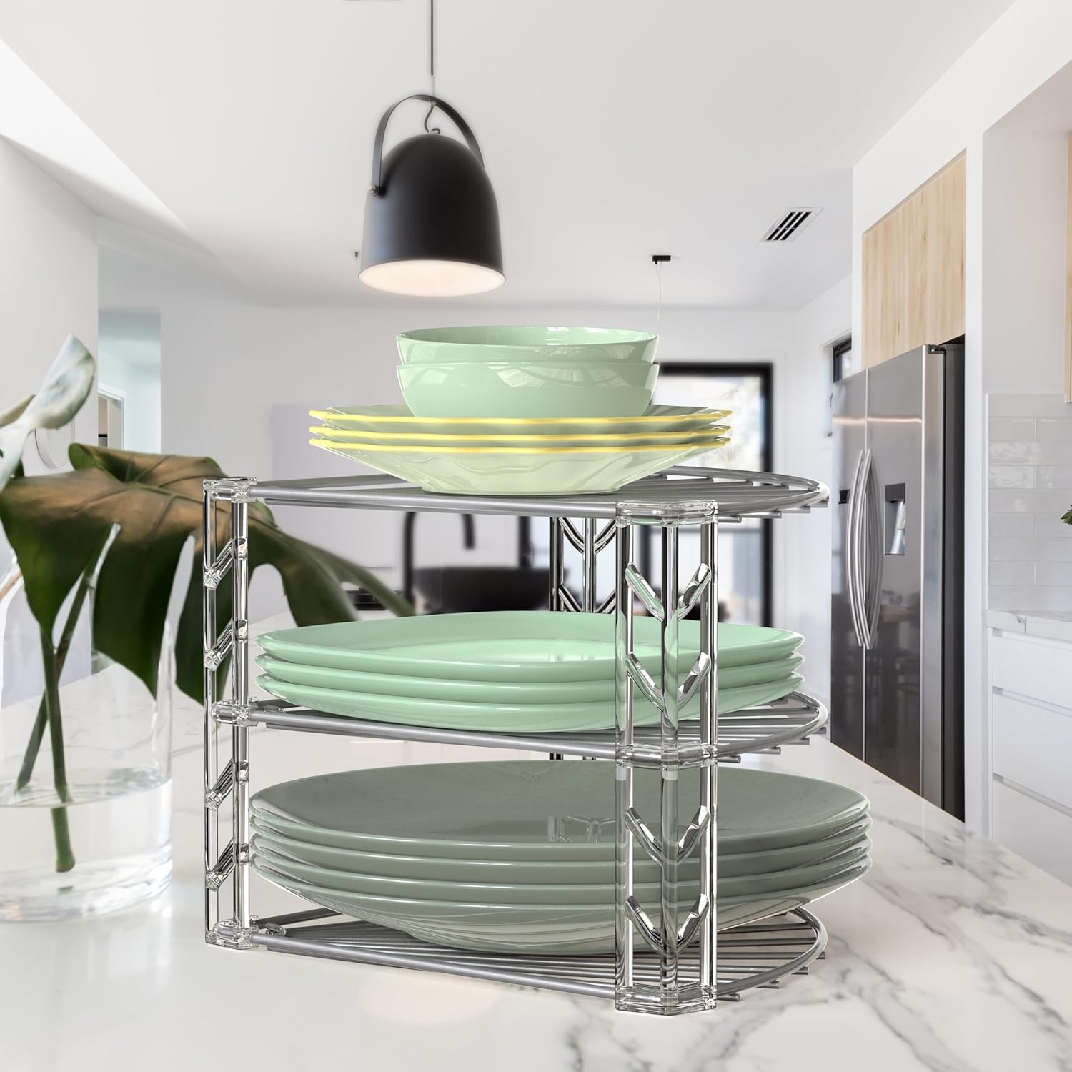 - 3 tier corner shelf to store pans, lids, and dishware on your counter or in your cabinet.
