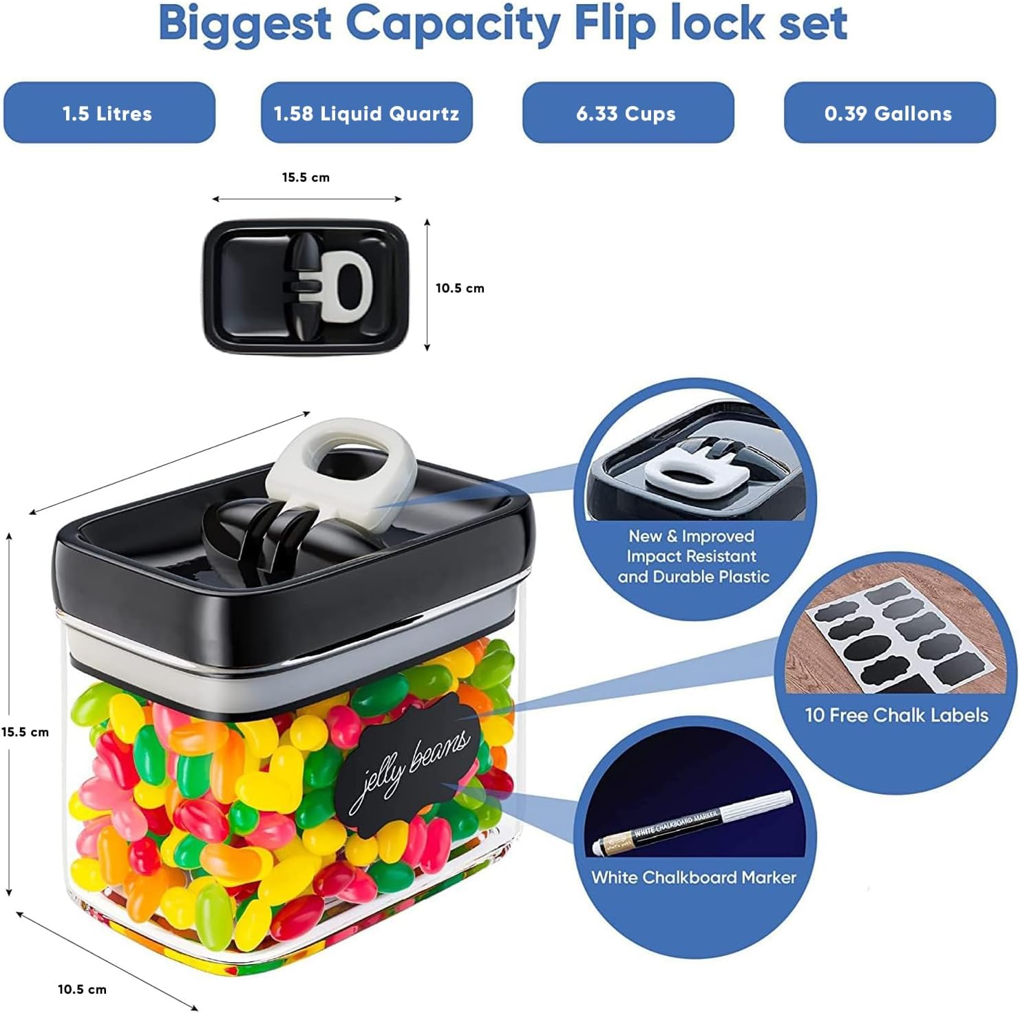 - Food storage box: upgrade your kitchen or pantry with our 6 stylish and airtight storage containers. Each has a capacity of 1.5 litres (1.3 QT/ 6.34 cups/ 0.40 gallons). The look of your kitchen will be second to none.