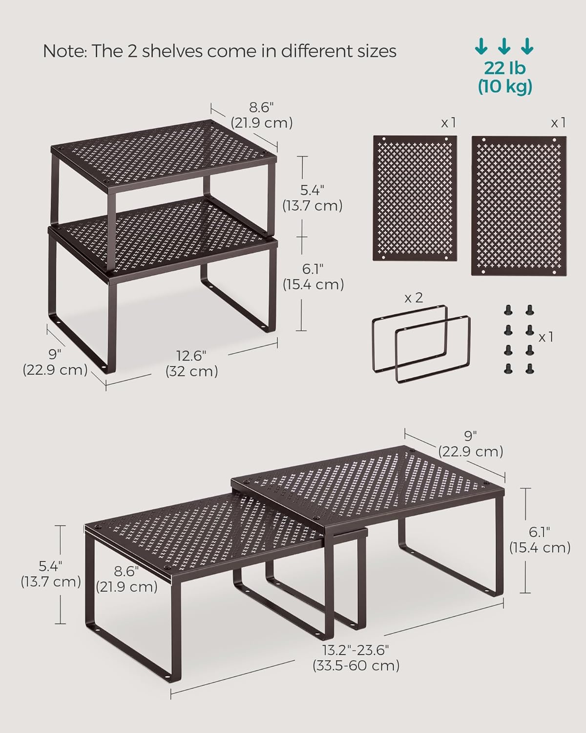 SONGMICS Spice Racks, Set of 4 Metal Cabinet Shelf Organizers, Countertop Organizers, Shelf Risers, Stackable, Expandable, Brown UKCS06BR