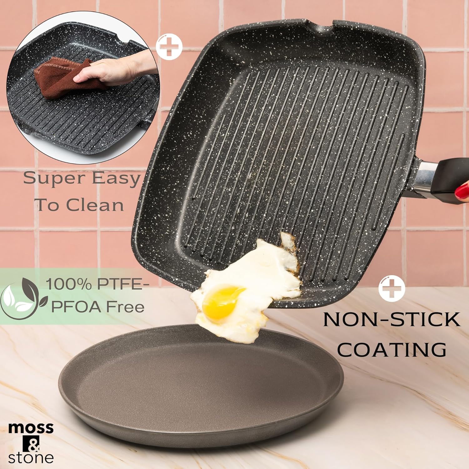 Moss & Stone Aluminum Nonstick Grill Pan for Stove Tops, Versatile Griddle Skillet with Pour Spouts, 11 Inch Square Grill Pan Big Cooking Surface, Durable Skillet For Indoor Cooking & Outdoor Grilling