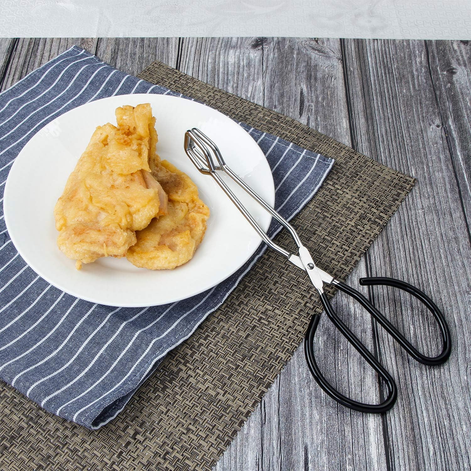 - PROFESSIONAL QUALITY: 1 x 10 inch scissor tongs .The scissors tongs are made of food-grade stainless steel, and the square designed head features non-slip embossing which is very suitable for flipping turning and lifting food