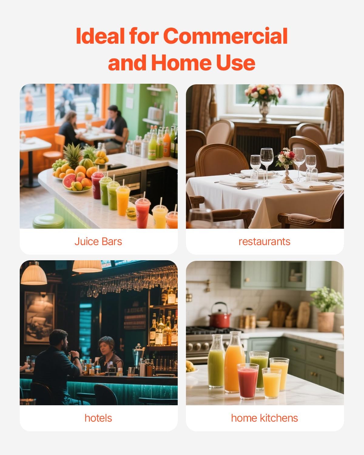 - Wide Application: Commercial juice extractor, easily juices various kinds of fruits and vegetables according to your own need. Large opening allow putting in whole raw materials. Great for juice shops, restaurants, hotels and family usage.