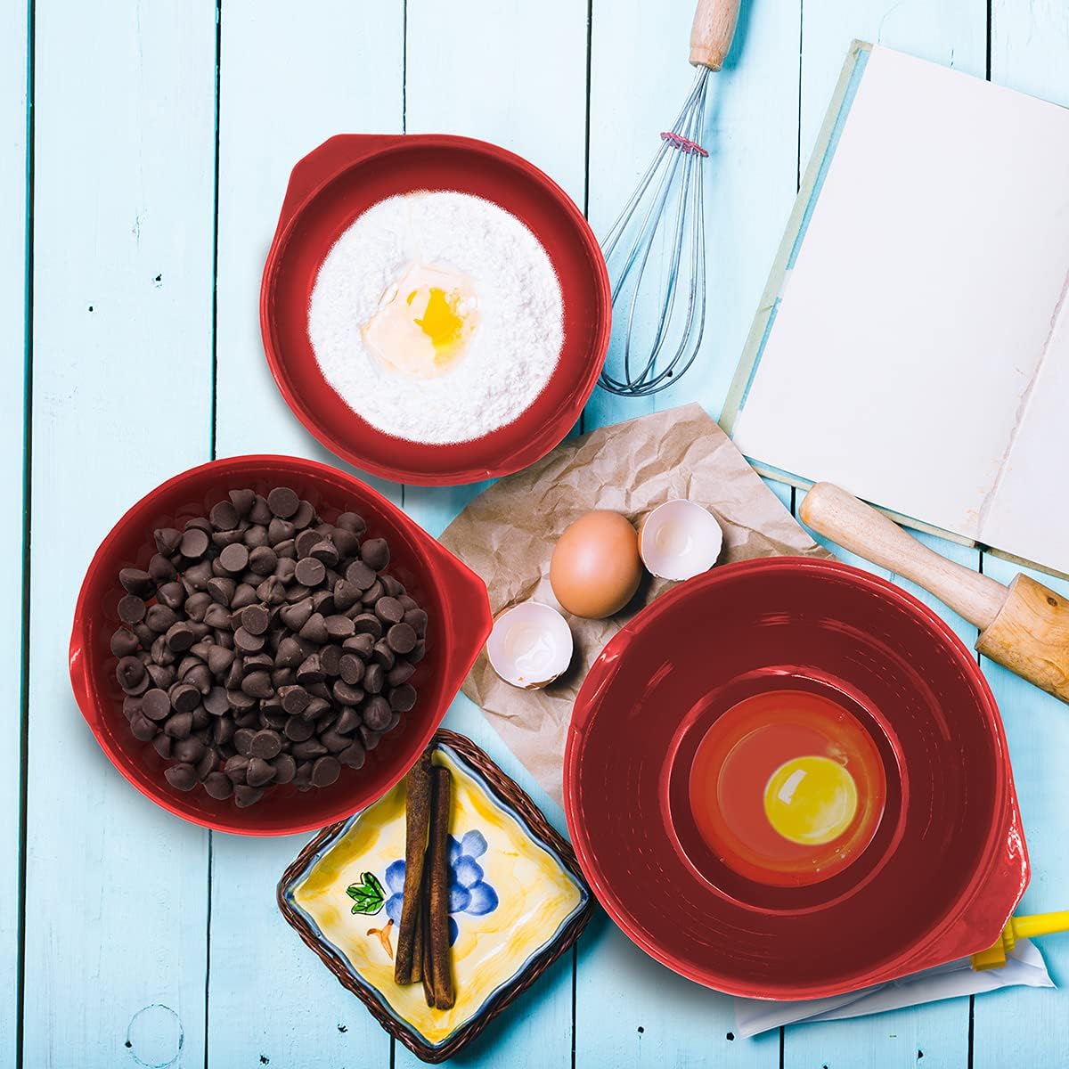 - EMBEDDED POUR SPOUTS β Each bowl is designed with a pour spout on one end and a lip on the other end for easy handling. Perfect for trained chefs, bakers and beginners alike, these bowls make it easy to mix, stir and pour batters or sauces.