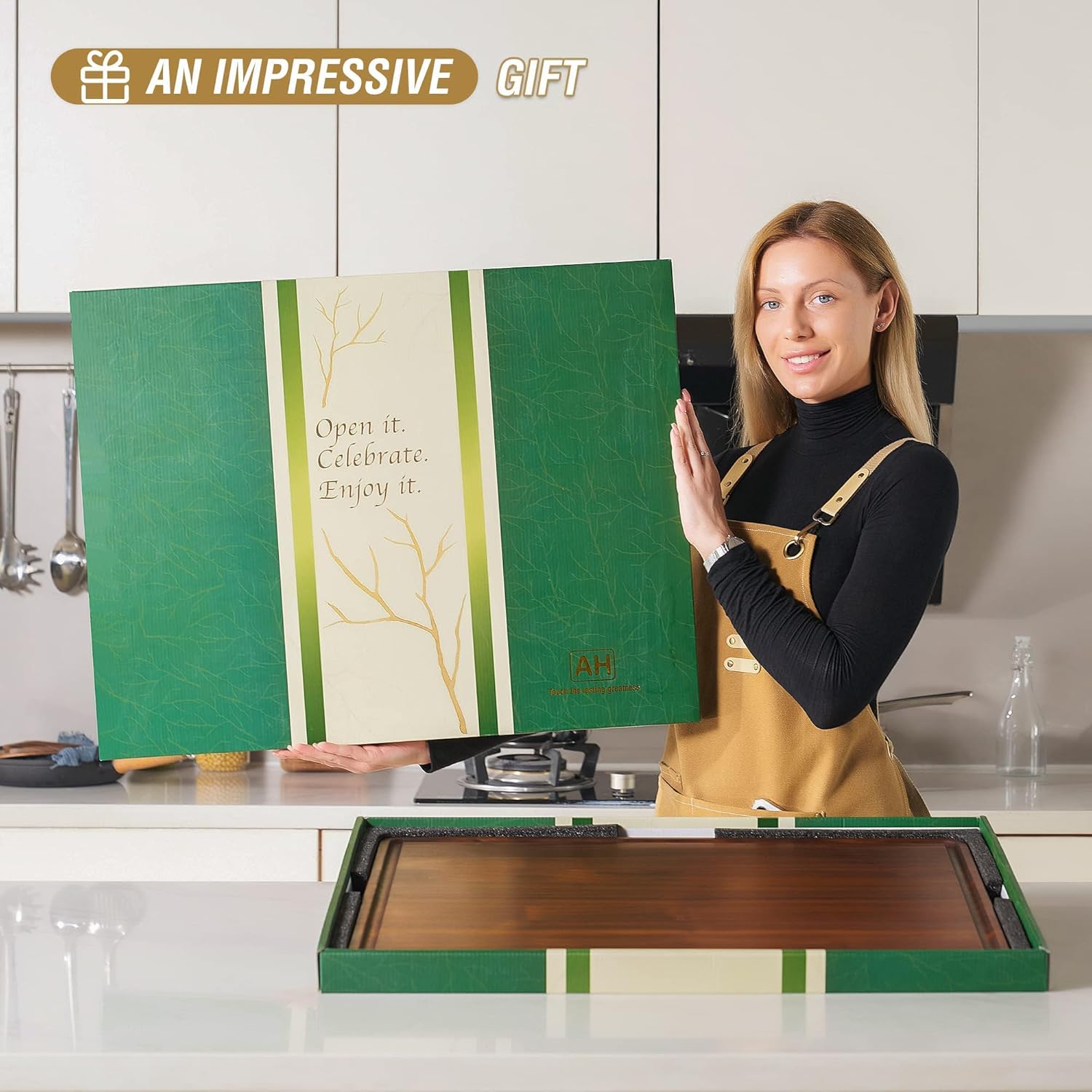 - KNIFE FRIENDLY– This all-natural board has perfect solidity and softness to prevent from blunting your knives. As with all wood cutting boards, it may show some knife marks, but when cared for properly (instructions in the box) it will preserve the rich color and last longer.
