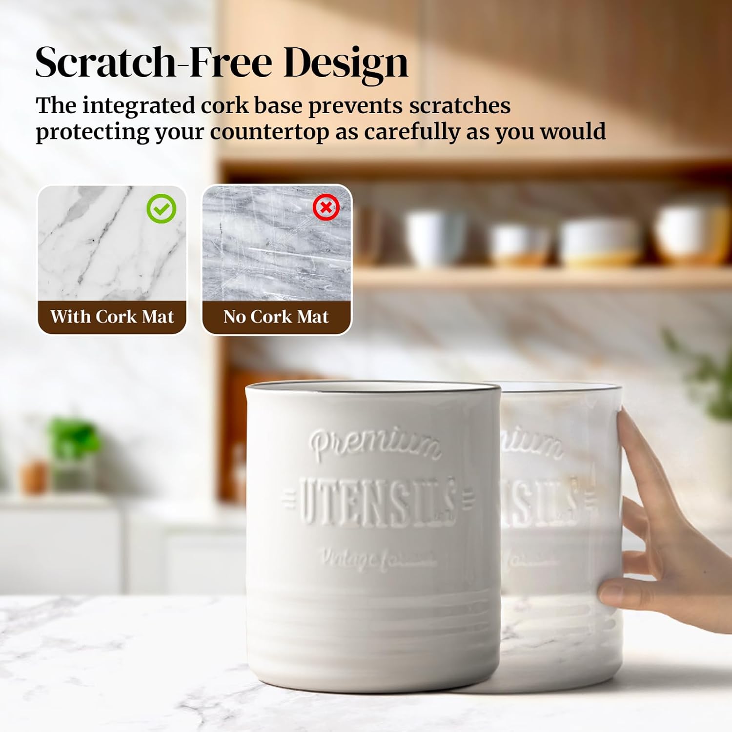 - Counter Protection Cork Mat: Featuring a specialized cork mat at the bottom, this white ceramic utensil crock offers enhanced protection for the surface of your table or countertop, effectively preventing scratches and damage.