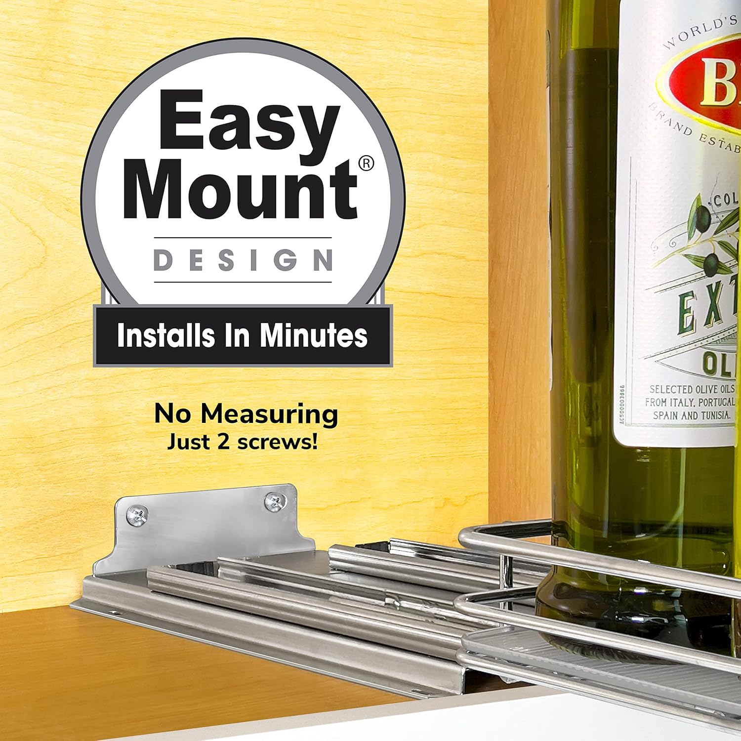- SETUP IS A BREEZE! – no struggling within limited space trying to place four awkward and difficult to reach screws inside your upper cabinets or into pantry shelves – our exclusive EASY MOUNT cabinet friendly drawer design installs with just two screws in the easily accessible back of your narrow cabinets – in minutes with no measuring!